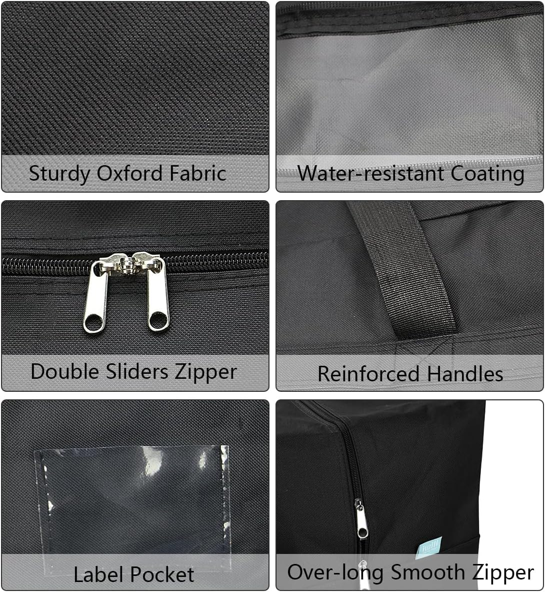 Dimension: 27.5*16.5 *13.8″(70*42*35cm), about 100 liters. It is the perfect choice for storage larger items. 3-way zip opening design makes it easy to open and put in or take out larger size items, such as Christmas tree, festival decoration lights, or bedding sets, blankets, pillows, quilts, etc.