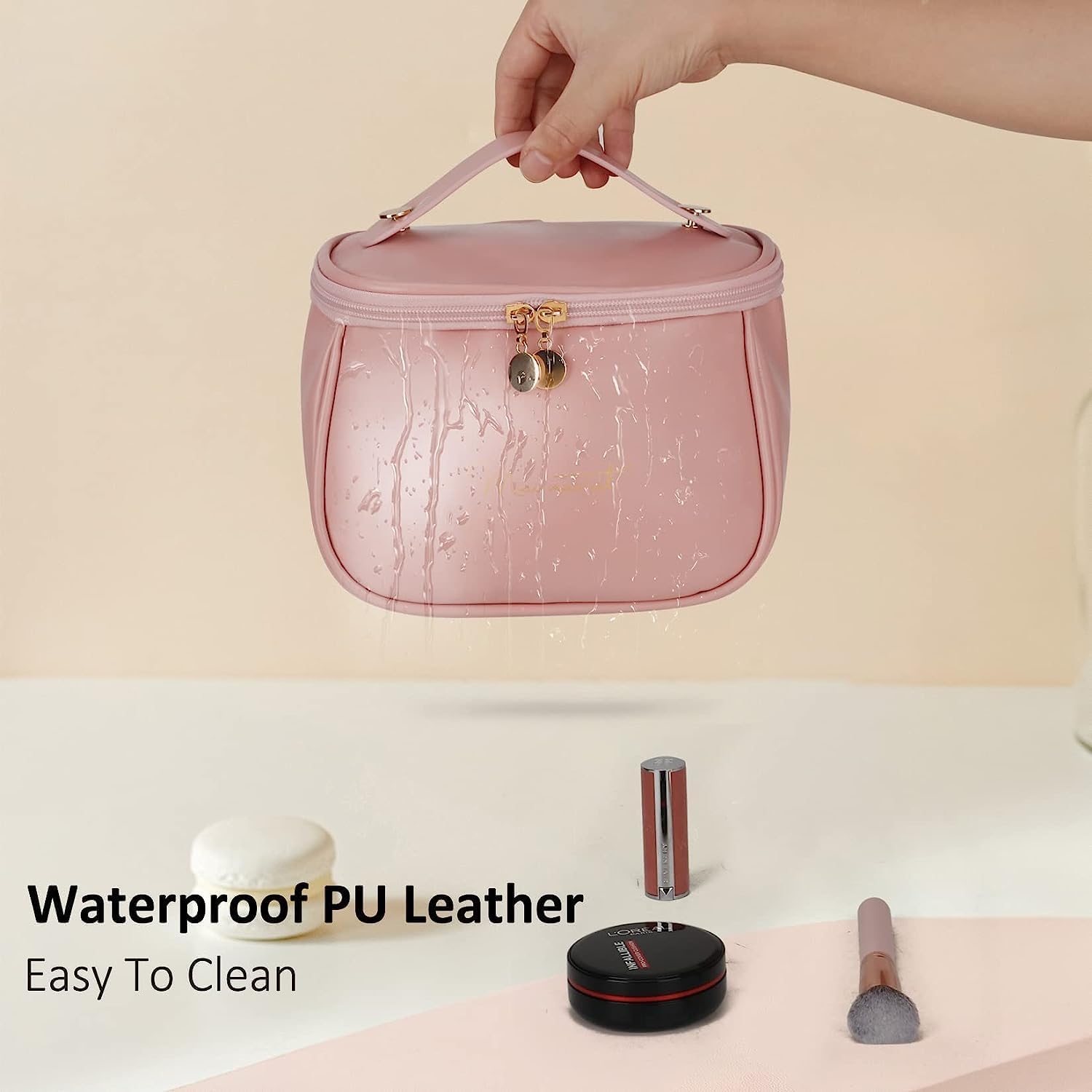 Large Capacity Travel Cosmetic Bag is made of upgrade PU leather fabric, waterproof surface prevents the products inside from getting wet.