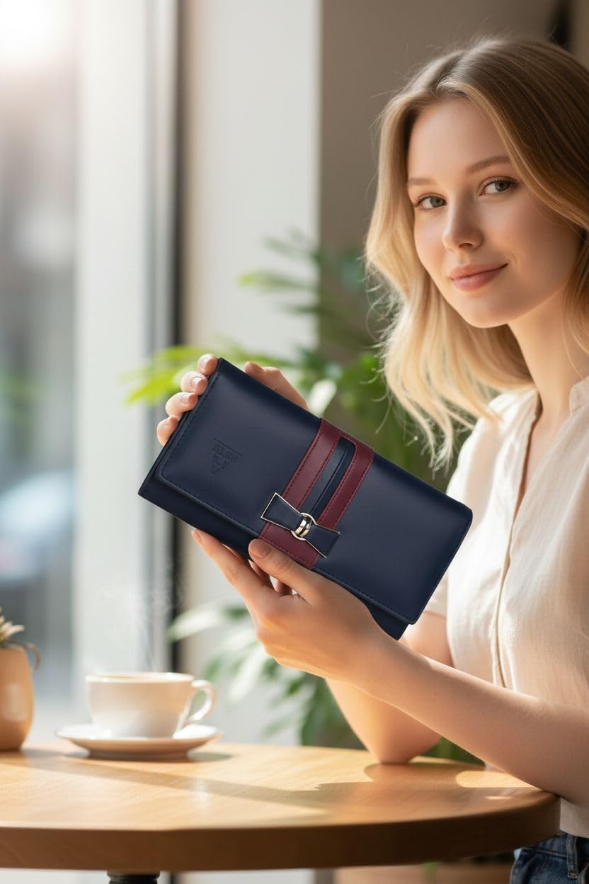 STUNNING DESIGN: Beautiful maroon body with navy strap and golden bow clasp for a sleek, fashionable look.