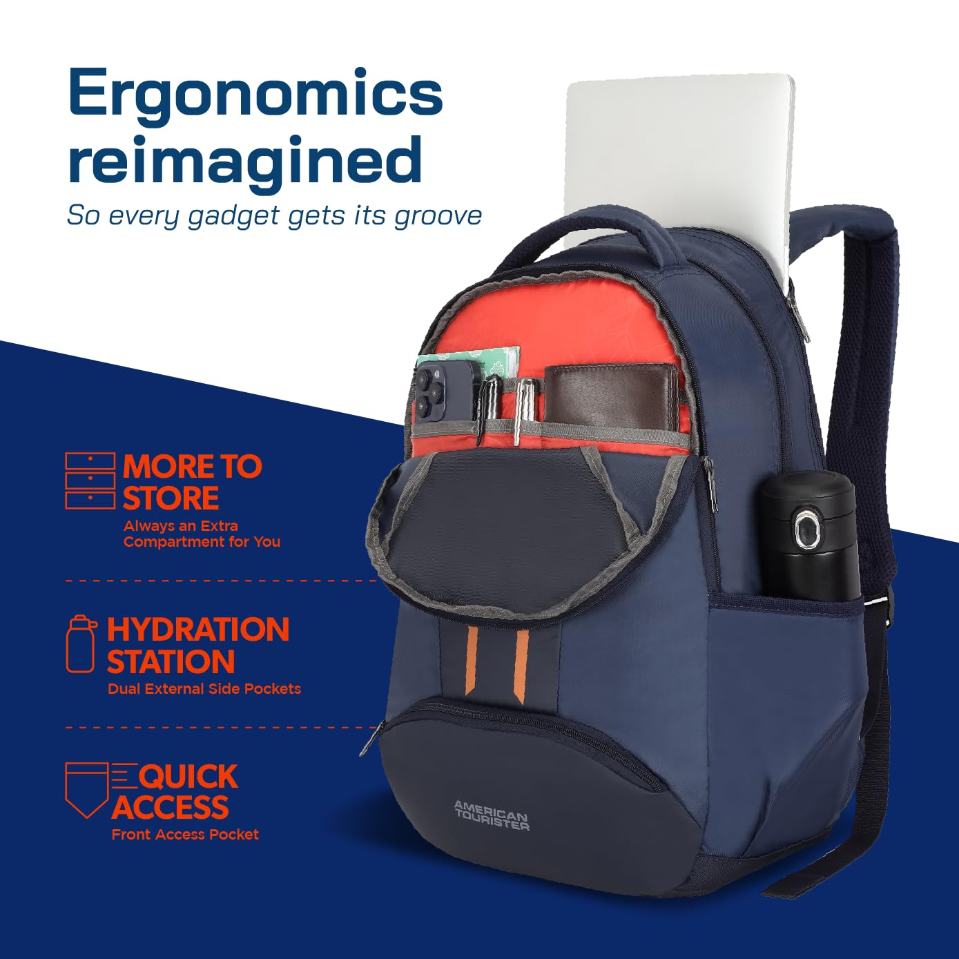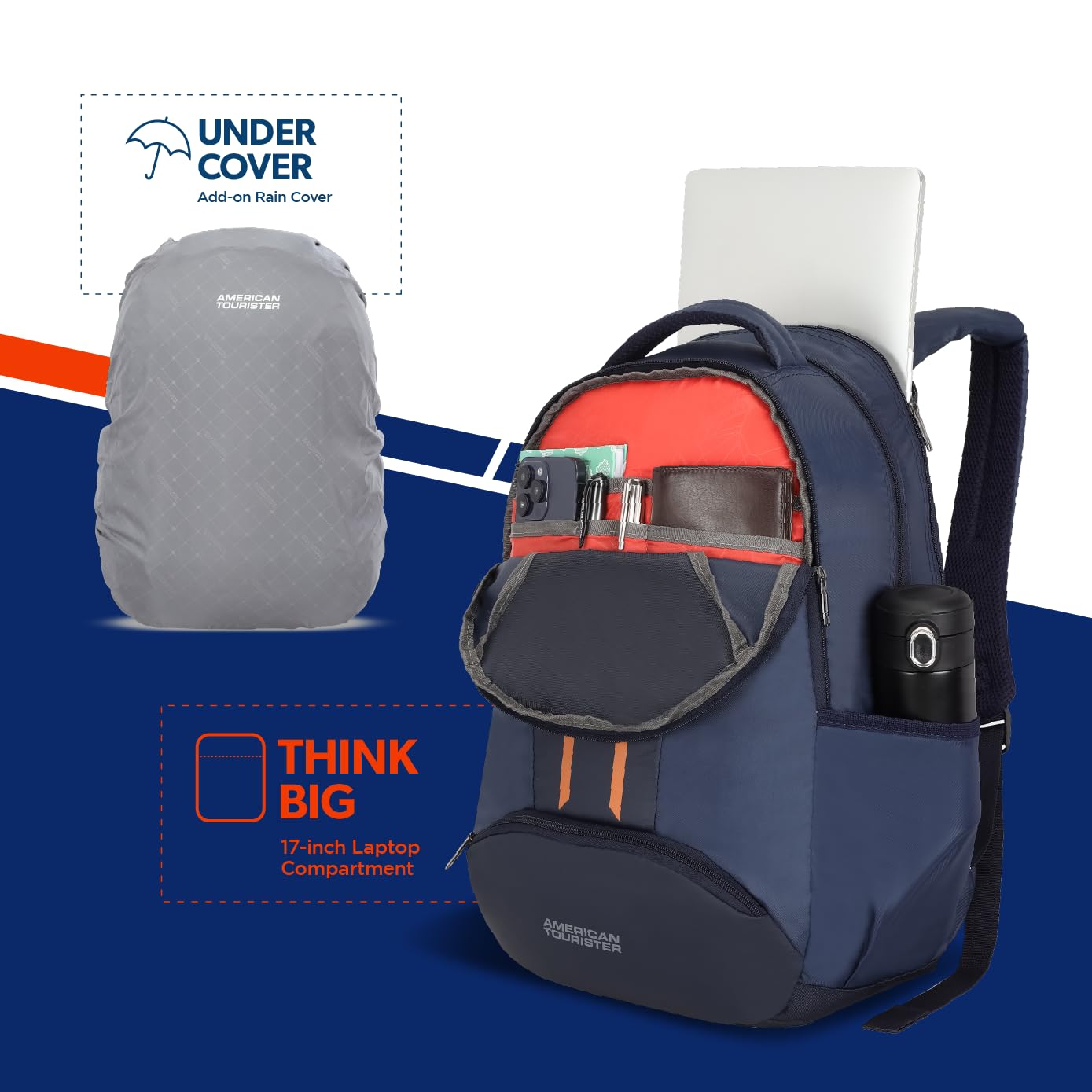 The American Tourister Mart+ is a 28L office laptop backpack designed for men and women, blending sleek style with practical features. Made from durable polyester, it is lightweight and strong for everyday use. Breathable mesh padding ensures lasting comfort, while spacious interior, a front organizer and dual side pockets keep essentials and water bottles neatly accessible. With a 1-year global warranty in 120 countries, it gives you peace of mind wherever your travels take you.