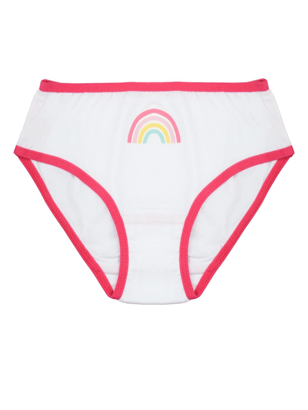 Bring a splash of whimsy and color to your little one’s wardrobe with this adorable pack of seven girls’ briefs. The set features eye-catching patterns including playful unicorns and joyful rainbows on a crisp white background, complemented by solid pink briefs for versatility. Each pair is thoughtfully designed with a comfortable elastic waistband and pretty pink trim detail. The cotton-rich fabric ensures all-day comfort, while the full-coverage style provides proper support. Perfect for everyday wear, these briefs come in mixed prints including magical unicorn patterns and rainbow motifs that little ones will love. A mix of patterned and solid designs provide variety throughout the week. The elastic edges are carefully crafted to prevent pinching or riding up, making these briefs ideal for active kids. These underpants retain their shape and vibrant color even after multiple washes, making them a practical choice for growing kids.