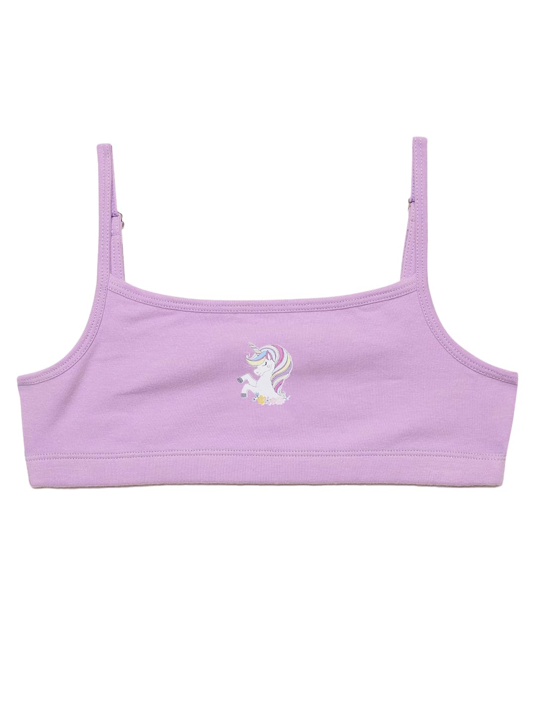 Introduce your baby to the world of comfort and style with this delightful pack of 4 teething bras. Each bra features an adorable unicorn placement print that adds a touch of magic to everyday wear. Made from a premium blend of 95% cotton and 5% elastane, these bras provide the perfect combination of softness and stretch for growing babies. This collection comes in attractive colors including lavender, pink, mint green and yellow, making them a fun addition to any wardrobe. The thin adjustable straps and simple pull-on design make them easy to wear, while the cotton-rich fabric ensures breathable comfort all day long. These training bras are ideal for young girls who are taking their first steps toward wearing undergarments, providing gentle support without any uncomfortable wiring or padding. The elastic band provides a snug yet comfortable fit that stays in place during daily activities. Perfect for everyday wear, these bras are easy to maintain and retain their shape and color wash after wash.