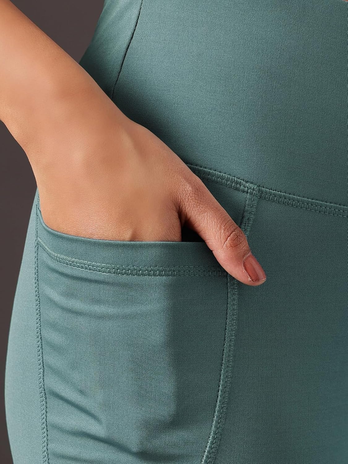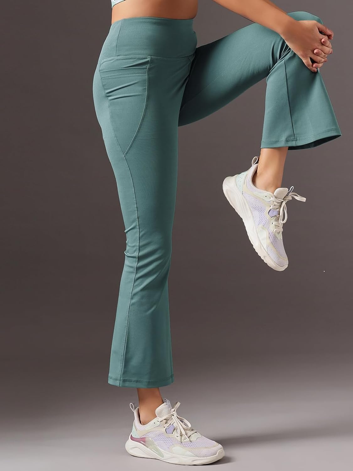 Ankle length high waist flared yoga pant is made from soft moisture wicking polyester spandex fabric. It has great elasticity, is resistant to sweat, and is comfortable. There is soft elastic at the waistband and leg opening for a snug fit. The soft fabric has wide elastic to provide extra abdominal support. There is a pocket on one side. Provides ease of movement and prevents wear and tear. Maximizes flexibility, mobility and performance. Perfect for cycling, running, zumba etc.