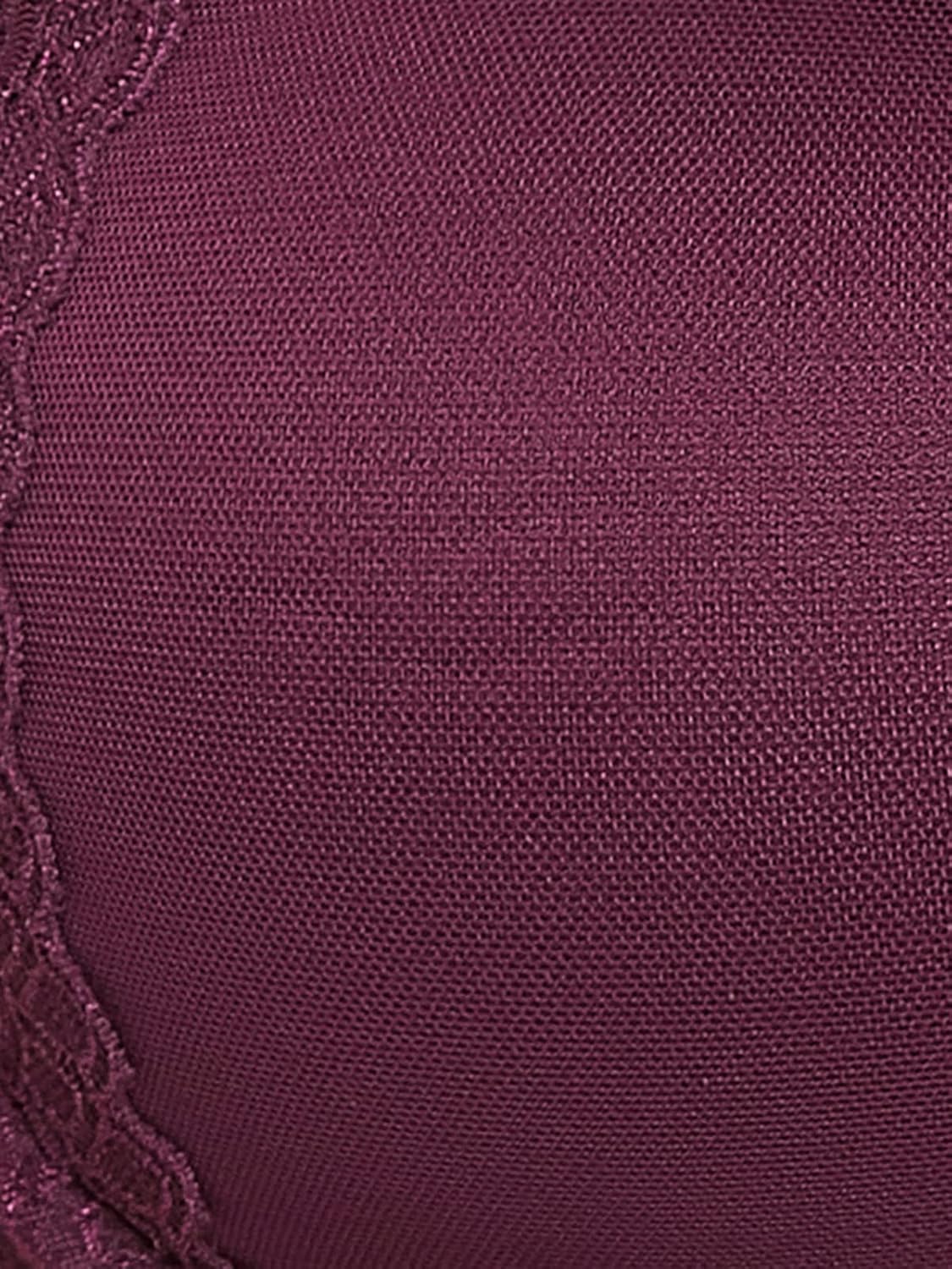 Padded bra made from powernet fabric. Dark purple solid bra. Padded cups for better shape and nipple coverage. Demi cup for 3/4th coverage. Underwired for support and lift. Can be worn as a strapless bra. Has detachable straps.
