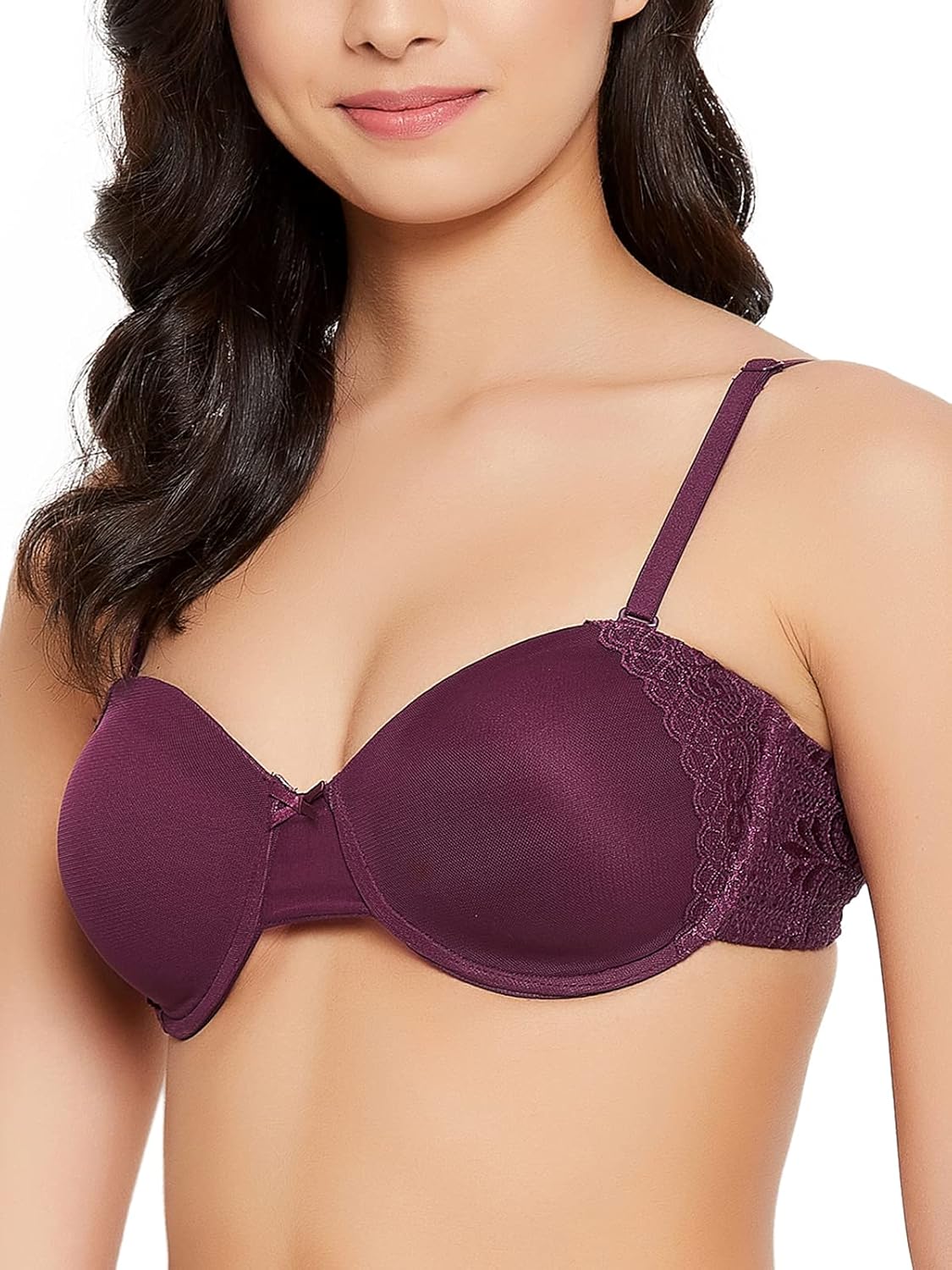 Padded bra made from powernet fabric. Dark purple solid bra. Padded cups for better shape and nipple coverage. Demi cup for 3/4th coverage. Underwired for support and lift. Can be worn as a strapless bra. Has detachable straps.
