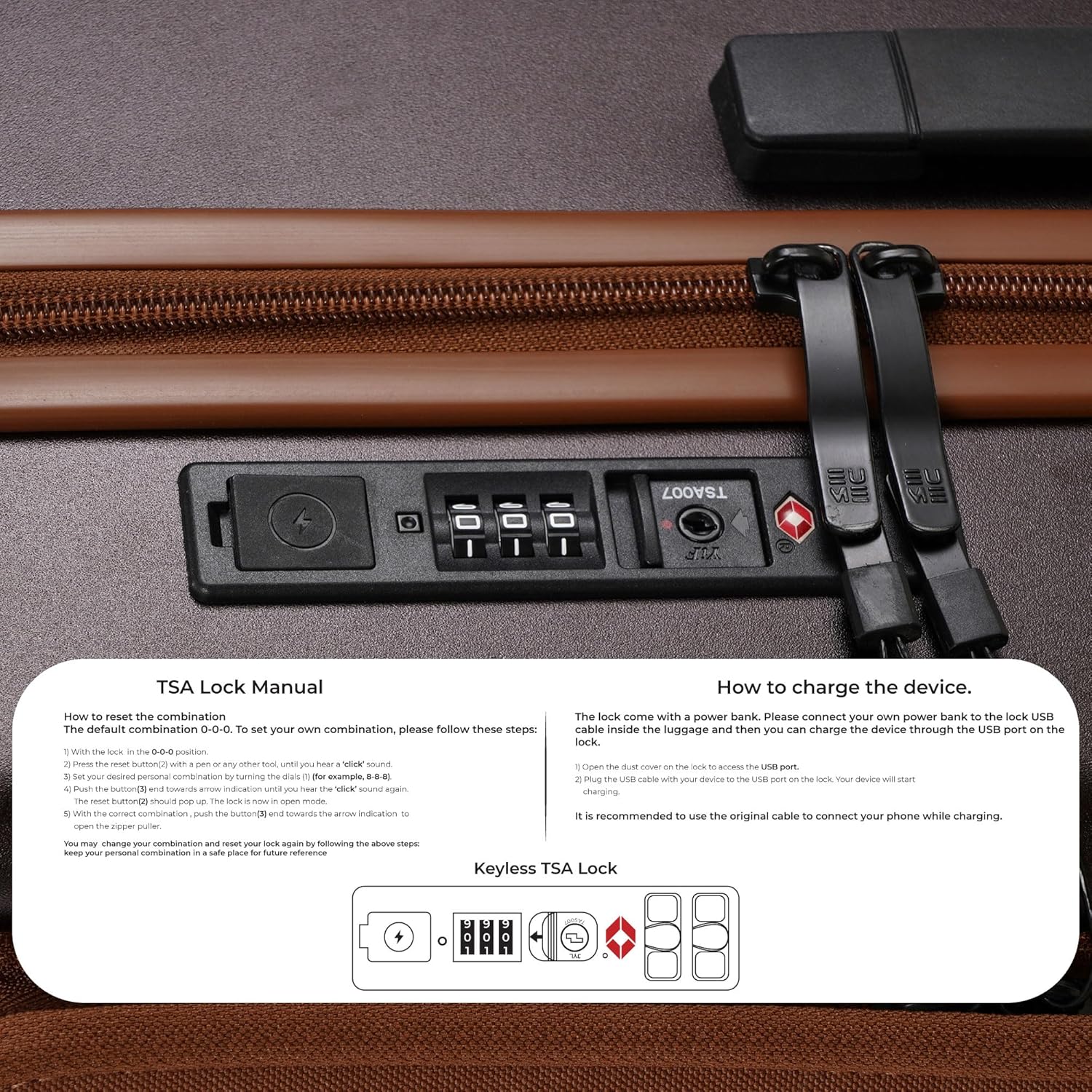 The polycarbonate luggage trolley includes side stands that protect from scratches and serve as hooks for small bags. A back-mounted bottle holder in the cabin luggage trolley keeps bottles or coffee mugs safe, adding convenience to your journey. Security is enhanced in this small laptop trolley bag with SBS antitheft zipper, TSA-approved locks, and power bank pocket slot with A and C type charging ports. The luggage trolley’s Silent-Run Pro double wheels, powered by Hinomoto Japanese technology, ensure smooth operation and effortless mobility.