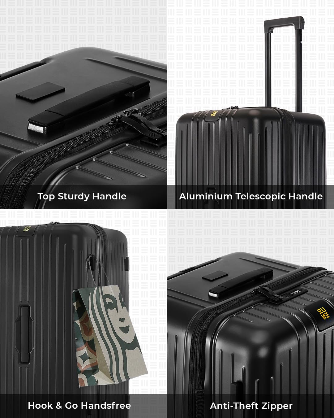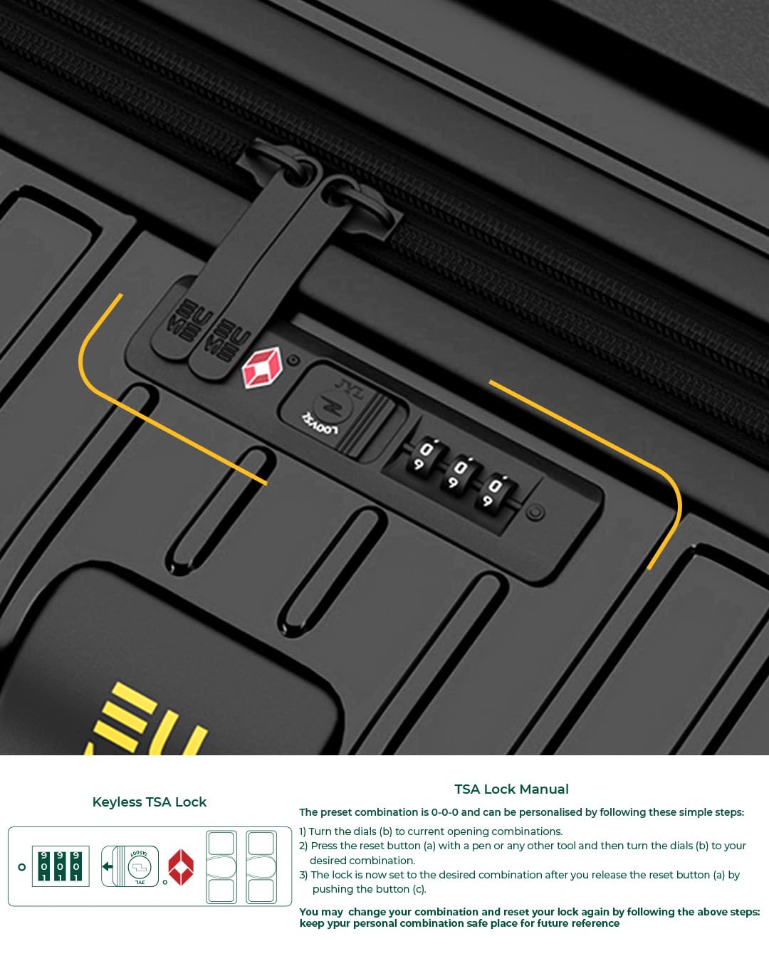 This luggage bag is crafted from durable 100% German Bayer polycarbonate (PC), ensuring a lightweight yet sturdy construction. These travel bags feature EUME SilentRun 360-degree double wheels, cushioned axles, and TSA-approved locks for smooth, secure travel.