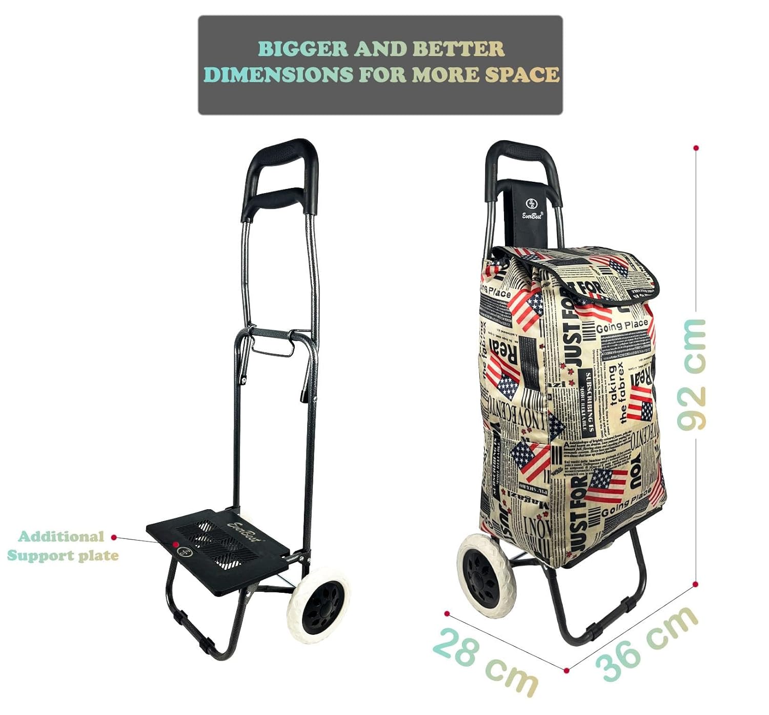 Product Dimensions: 92 cm x 36 cm x 28 cm Weight: 1.9 kg Flag print design Compact folding Load carrying capacity: 12 to 15 kg Large rubber 6.3 inch diameter wheel