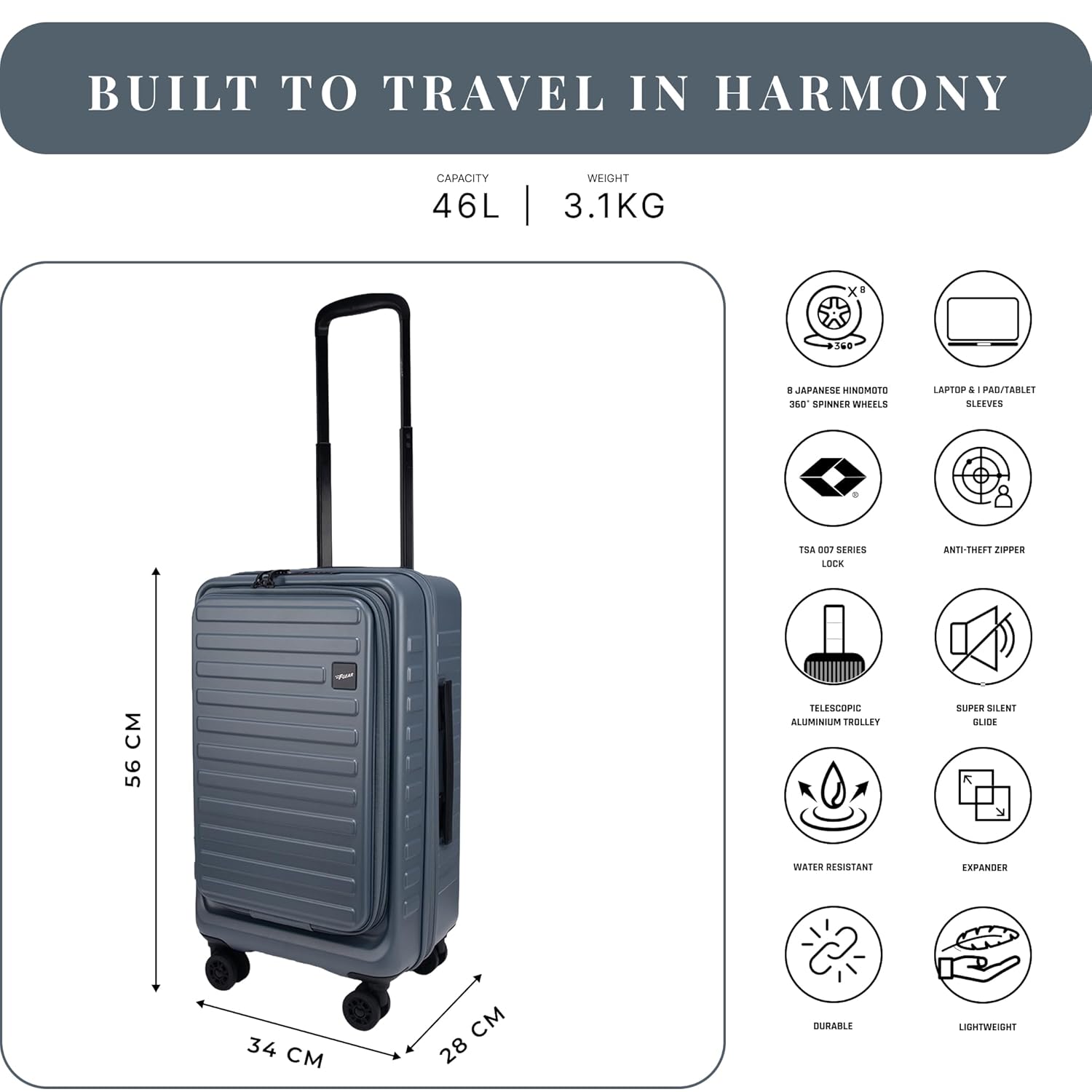 Experience modern convenience and superior security with the F Gear Windsor Front-Opening Cabin Trunk-Style Hard Luggage. Designed for travelers who value quick access, it features a smart front-opening compartment with a padded laptop and tablet sleeve, allowing you to quickly access your devices or essentials during airport security checks or when traveling in tight spaces. Move easily through the terminals with 8 Japanese Hinomoto 360° spinner wheels engineered for smooth, stable and silent gliding. The suitcase is constructed using German Bayer polycarbonate, a premium material known for its exceptional impact resistance and durability, while maintaining an impressively lightweight feel at just 3.1 kg. The trunk-style interior offers a spacious 46L cabin-friendly capacity with 3 interior pockets for organized packing. Thoughtful details such as 4 durable bushings, 2 of which act as multipurpose hook points, provide added convenience for hanging bags or accessories during travel. An extender adds extra space whenever you need it. Handling the Windsor is easy due to the 3-tier telescopic aluminum trolley, supported by comfortable top and side handles for easy lifting. Your luggage remains secured with anti-theft zippers and secure TSA 007 series number lock, ensuring hassle-free travel at international airports. The included protective luggage cover keeps the suitcase clean and scratch free between trips. A perfect blend of practicality, sturdiness and sophisticated design, the F Gear Windsor is designed to be your ideal companion for work trips, weekend getaways and global travel – with a 3-year carry-in warranty for complete peace of mind.