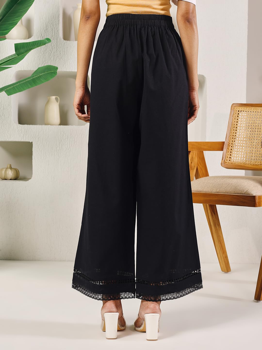 The Fiora Off-White Palazzo Pant, crafted from soft and breathable cotton, offers a flattering silhouette and all-day comfort. Designed with delicate lace detailing at the hem, these palazzos are perfect for casual outings or to wear with ethnic wear for a chic, effortless look.