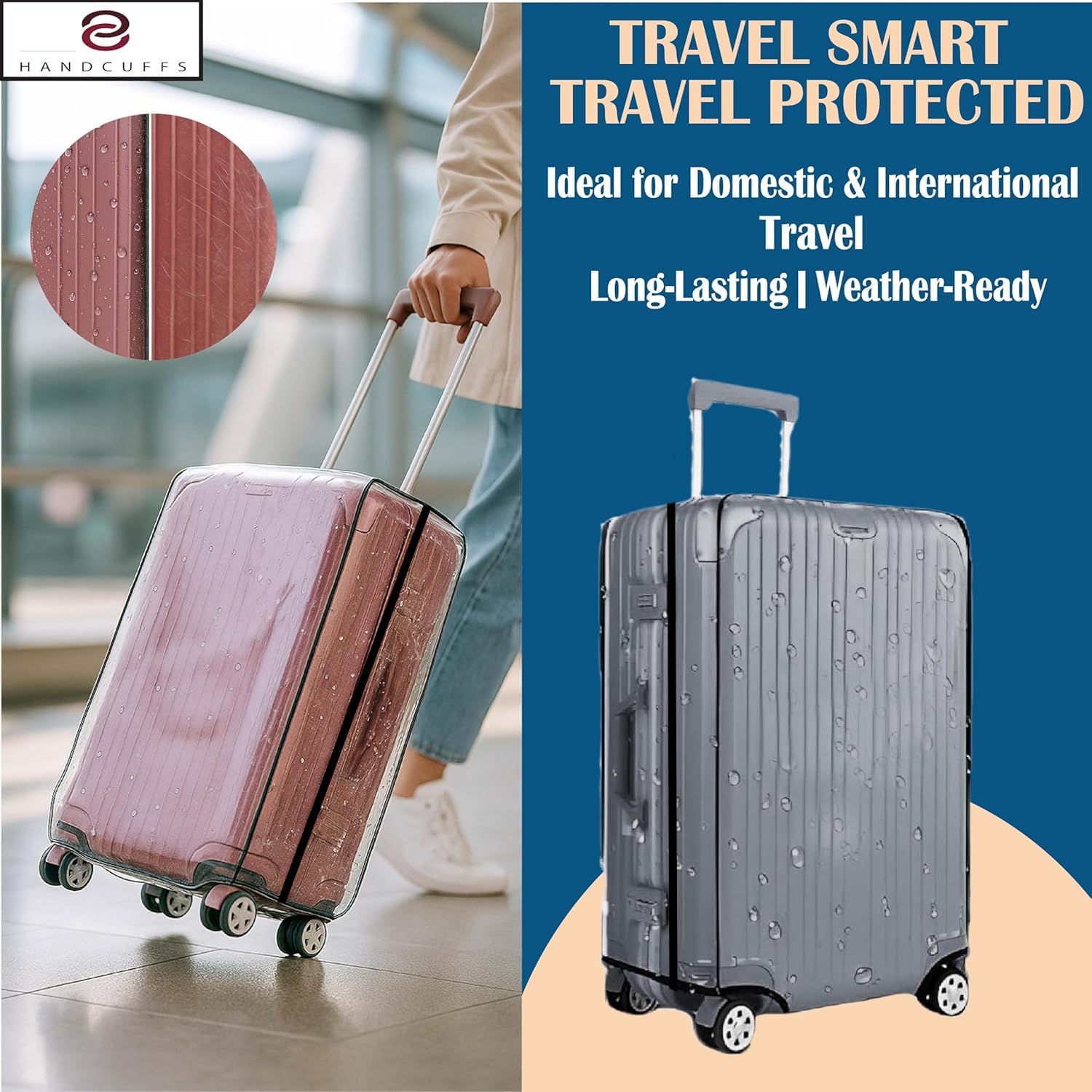 SUPER QUALITY HANDCUFFS PVC Luggage Cover (Transparent) This clear luggage cover protects your luggage from scratches, stains. It can help you identify your beloved luggage in a crowded airport. The suitcase protector made of high quality PVC material, reusable and provides full protection to your luggage, with durable velcro on the bottom, easy to press and install 1 pc luggage cover (no suitcase included), Brand Owner: Shackle
