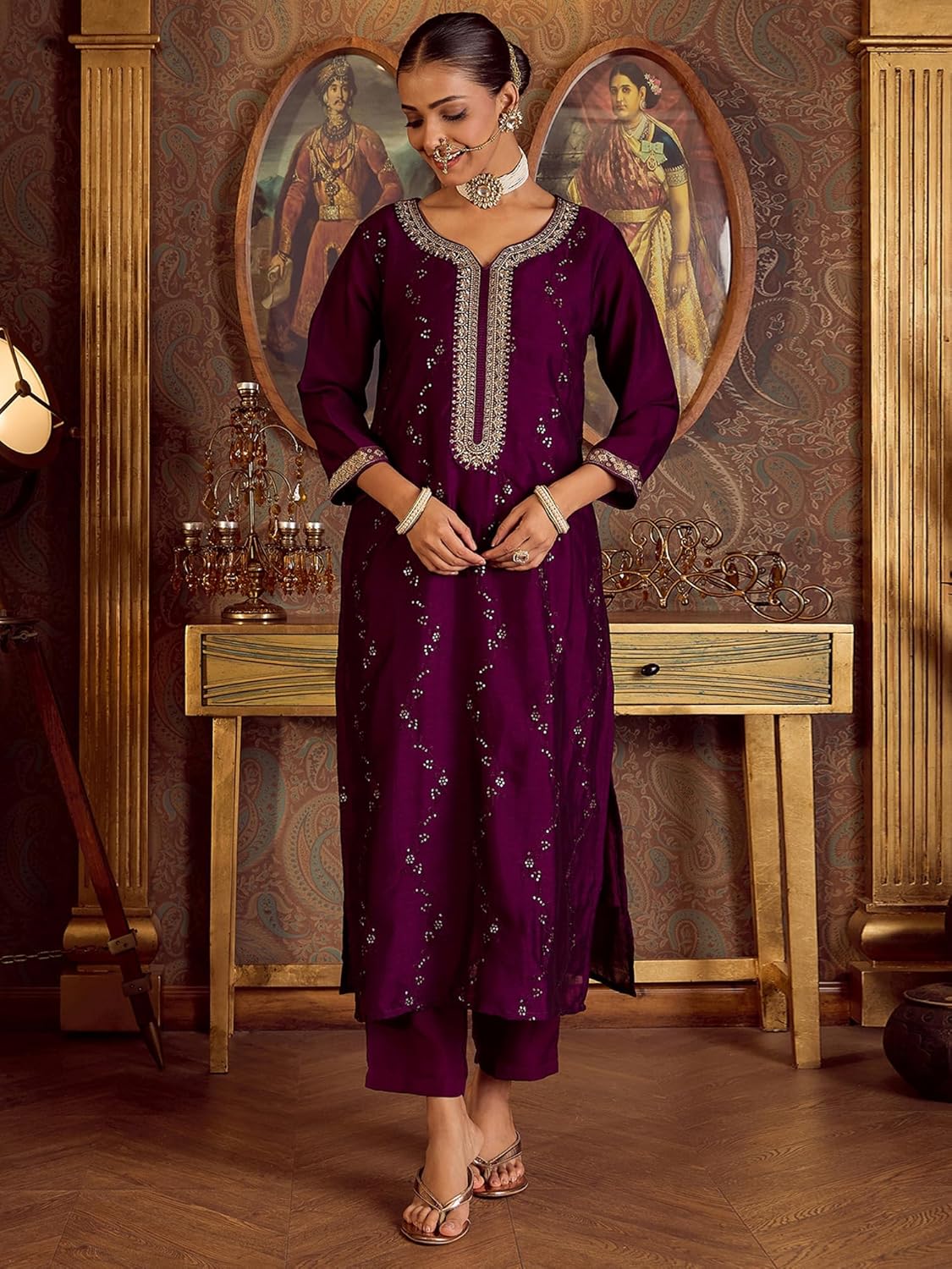 Generic Name : Purple Embroidered Straight Kurta Trouser with Dupatta Set