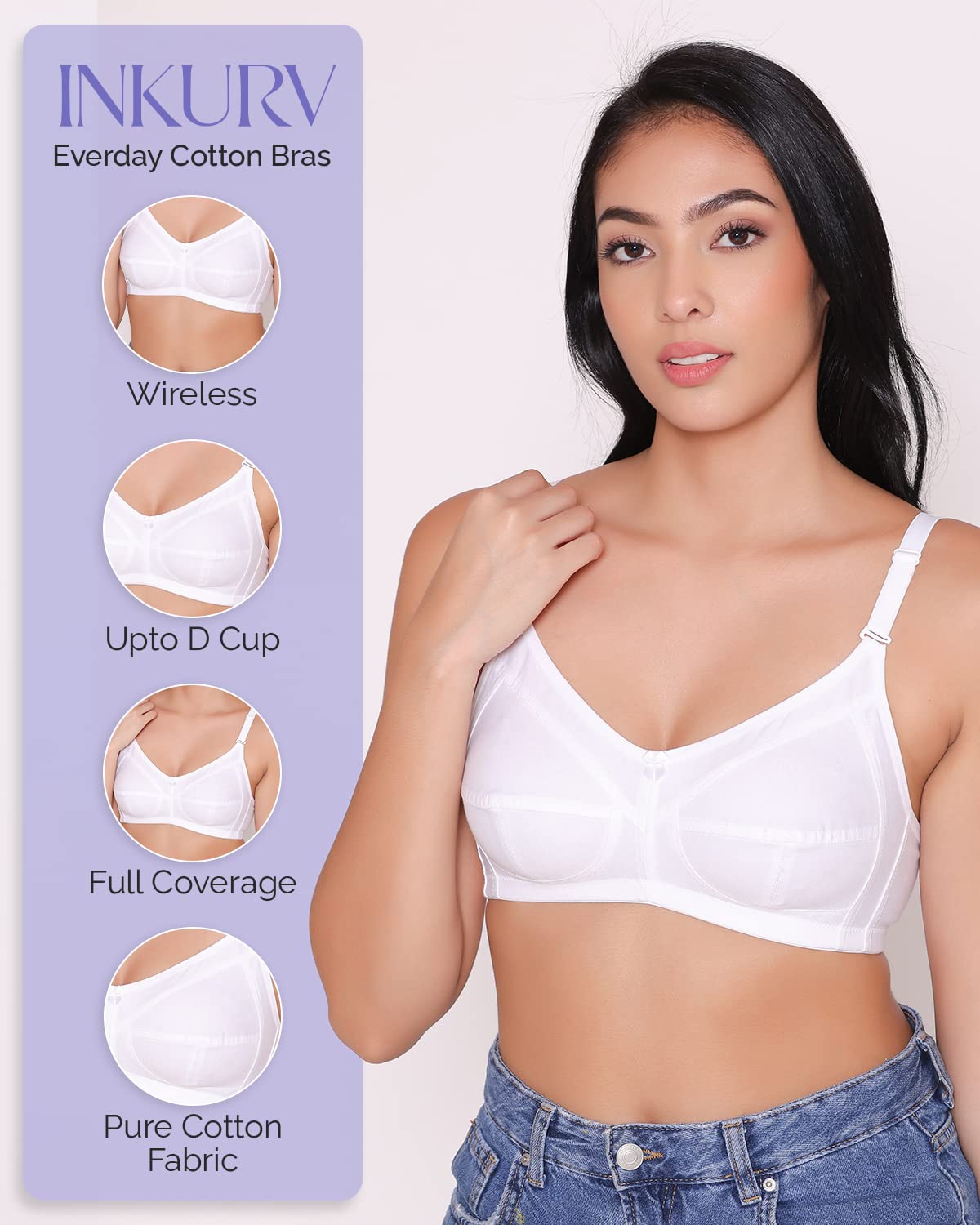 Meet our bestseller bras and get the support and comfort you’re looking for with this full coverage cotton minimizer bra. With 3 stitch cuts and stitch cups, you can layer with your favorite pieces for a casual ensemble. Confident outside, comfortable inside. Available in BCD cups, this cotton bra will ensure that your breasts stay in place while you do your daily activities. Our everyday bras are carefully designed with full coverage to ensure there are no bulges and you feel more confident in whatever outfit you wear. INKURV specializes in non padded non wired bras for all day wear. What makes us unique? Our bras fit you perfectly under all your attire like blouse, kurti, kurta, suit, saree, anarkali etc. If you are one of those who experience side spillage or top spillage, this full-coverage bra is the ultimate solution to your problem. Non-padded cups provide maximum coverage and leave no leakage. This is an everyday wear bra and can be worn with all your formal, casual, western and ethnic outfits. The bra has non-wired cups and hence provides a poke-free experience. It comes with detachable straps and hence you can wear it with transparent straps also. Key features include excellent quality, comfortable fit, soft fabric, classy and stylish, very rich look and an amazing range of colors to choose from! Sizes are available from 30B to 44D.