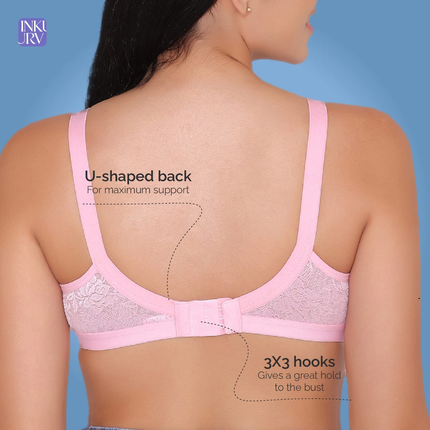 This is a non-padded pack of 2 bras that gives excellent support to your breasts. If you are one of those who experience side spillage or top spillage, this full-coverage bra is the ultimate solution to your problem. Paneled with net shaper on top, it gives you a stylish look. The cups provide maximum coverage and allow no leakage. This is an everyday wear bra and can be worn with all your formal, casual, western and ethnic outfits. The bra has non-wired cups and hence provides a poke-free experience. This is a full coverage bra for daily use that matches well with all your body-hugging outfits like t-shirts, fitted tops, one-piece dresses, etc. This bra also works well under blouses, kurtis, suits, sarees, anarkalis etc. This is a pack of 2 full coverage bras. Material Composition: Rich Micro Cotton, Polyamide and Spandex. The inner layer is of cotton blend fabric which is soft and feels exactly like baby clothes. The power net used on the top of the cups is stretchable and soft which provides the desired support to the breasts. INKURV is known for non padded non wired bras for daily wear. We provide the best fit and support all day long. Just remember to choose the right size. Available in pastel colours, this is a regular bra from Inkurv. Recommended for loose breasts, this bra is available in B, C and D cups in sizes 30B-40D.