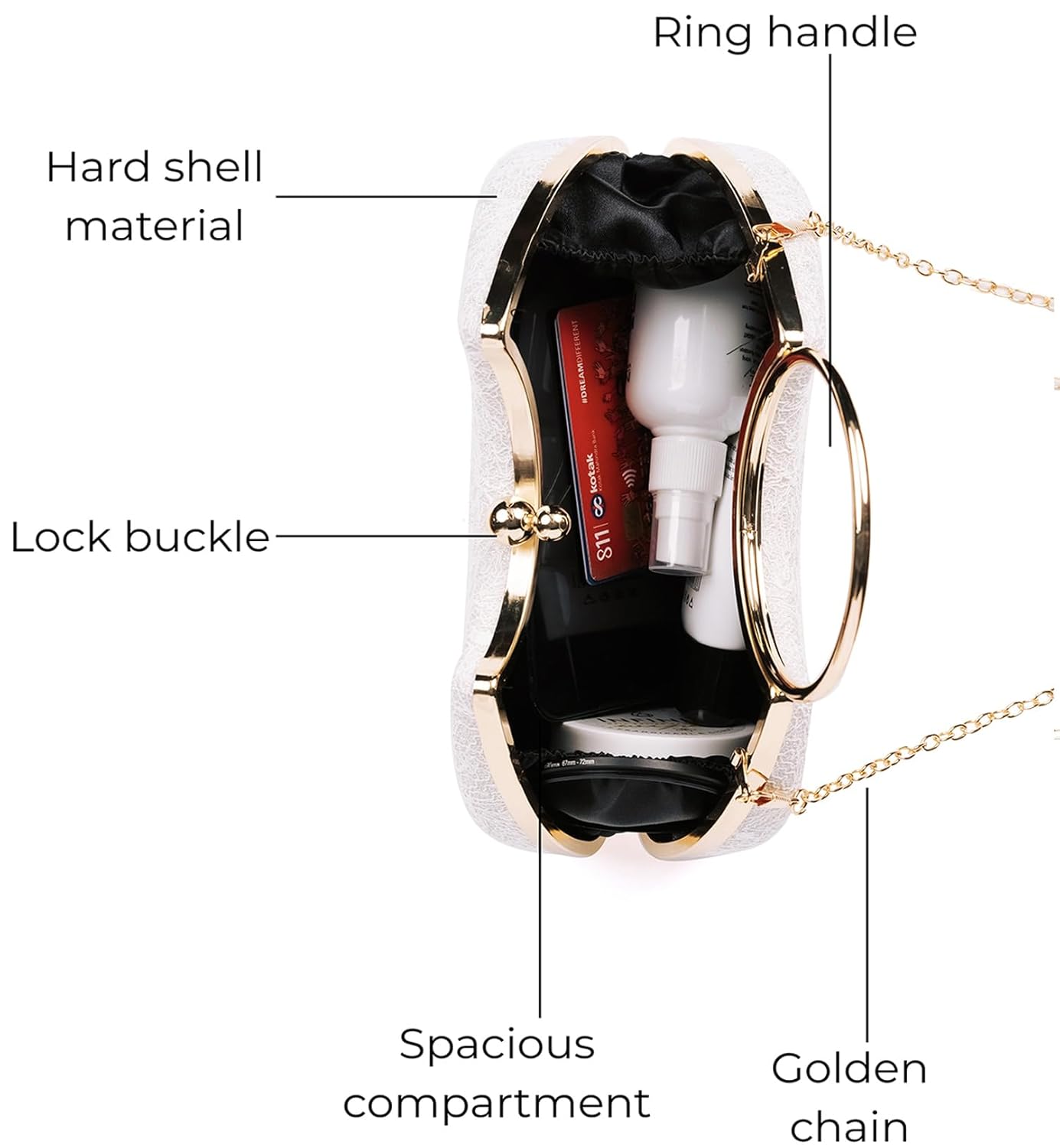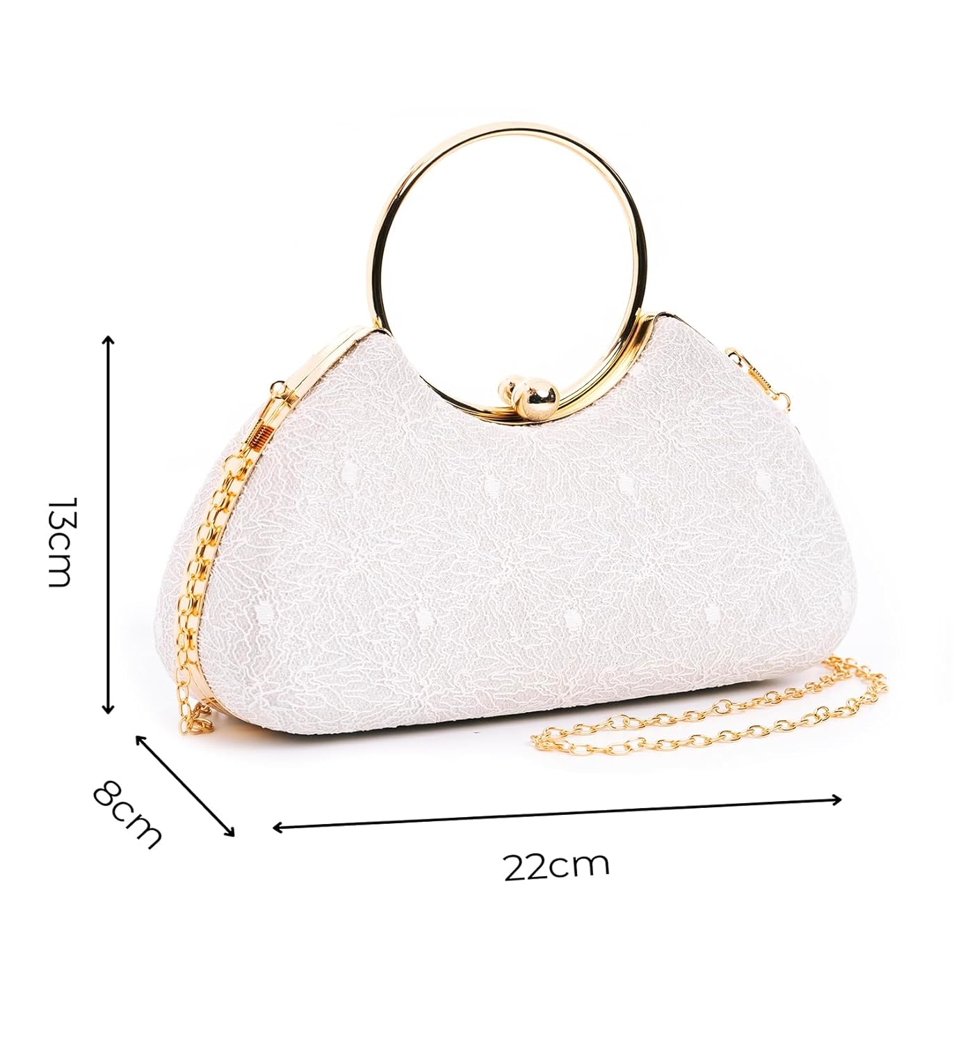 This stylish black clutch has a sleek, textured finish that adds a touch of sophistication to any outfit. Its unique silhouette is enhanced by the bold gold metal ring handle, combining fashion with function. Perfect for evening functions, weddings or large celebrations, it is designed to keep your small essentials safe. The top clasp closure ensures that your belongings stay safe while maintaining the attractive looks of the bag. Compact yet elegant, it seamlessly transitions from day to night. A perfect accessory for those who appreciate modern, minimalist design.