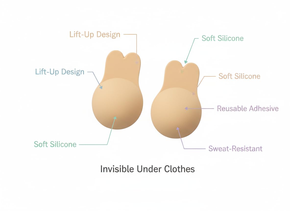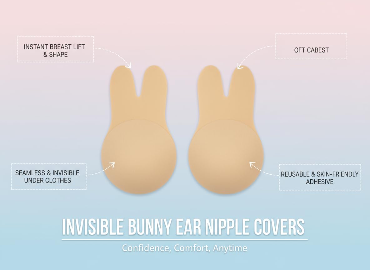 Transform your silhouette with these innovative bunny-ear shaped lift-up pasties. Crafted from soft, skin-friendly silicone, these reusable adhesive covers provide seamless coverage and natural lift while remaining completely invisible under clothing. The unique lift-up design provides comfortable support, while the sweat-resistant adhesive ensures they stay securely in place during wear. Perfect for backless dresses, strapless tops and other flowy outfits, these versatile pasties give you the confidence to wear your favorite styles. The premium silicone material is gentle on the skin and retains its adhesive properties with proper care. These nude colored pasties naturally blend with your skin tone, creating a smooth, seamless look under any outfit. Ideal for special occasions or everyday wear, these clever covers offer both modesty and elevation without visible straps or bands. Hand wash with mild soap and water to maintain adhesion for multiple uses.