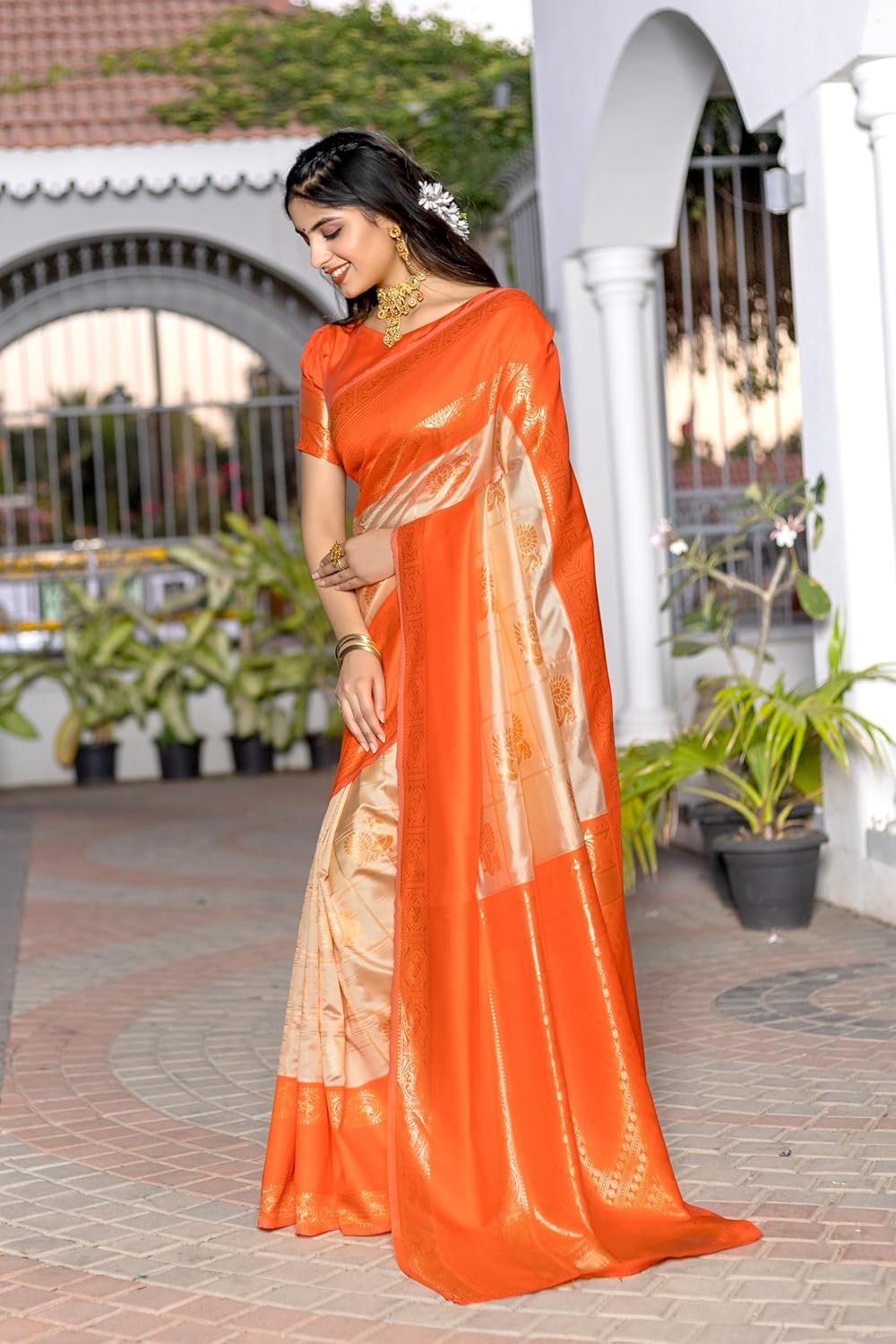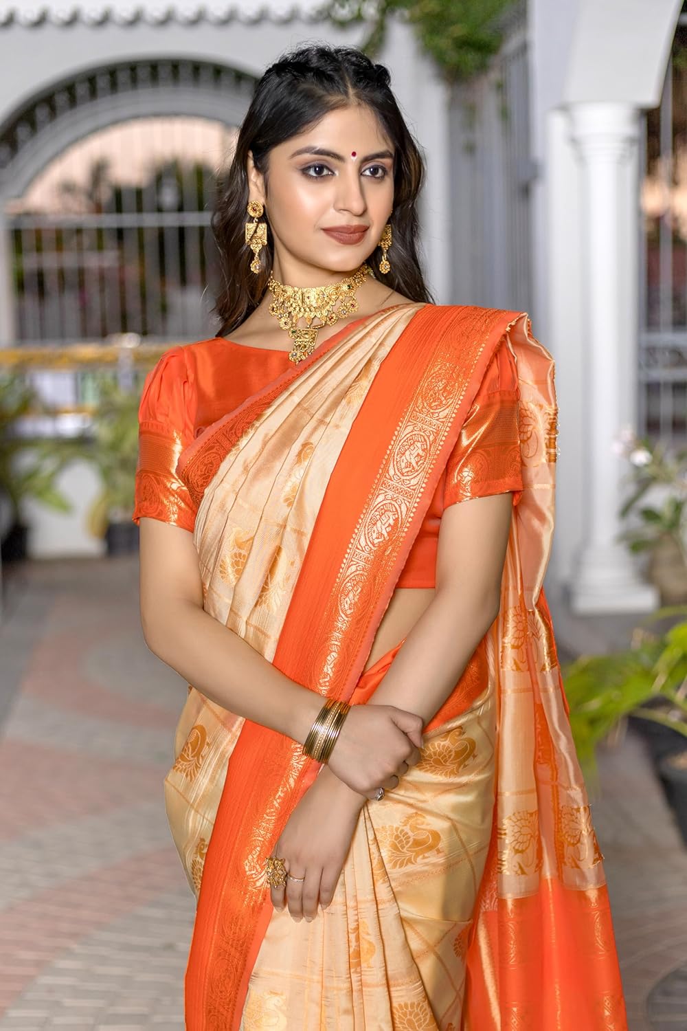 This Kanjeevaram silk saree is very beautiful. The work done on the saree makes it attractive. Kanchipuram silk saree is made from the finest fabric. Silk blouse enhances the look of saree. This Kanjeevaram silk saree will look great with earrings or even kundan jewellery. Shine in this festive season with Banarasi silk sarees. This is a beautiful saree for women 2024 from Janvi Fashion on Amazon.