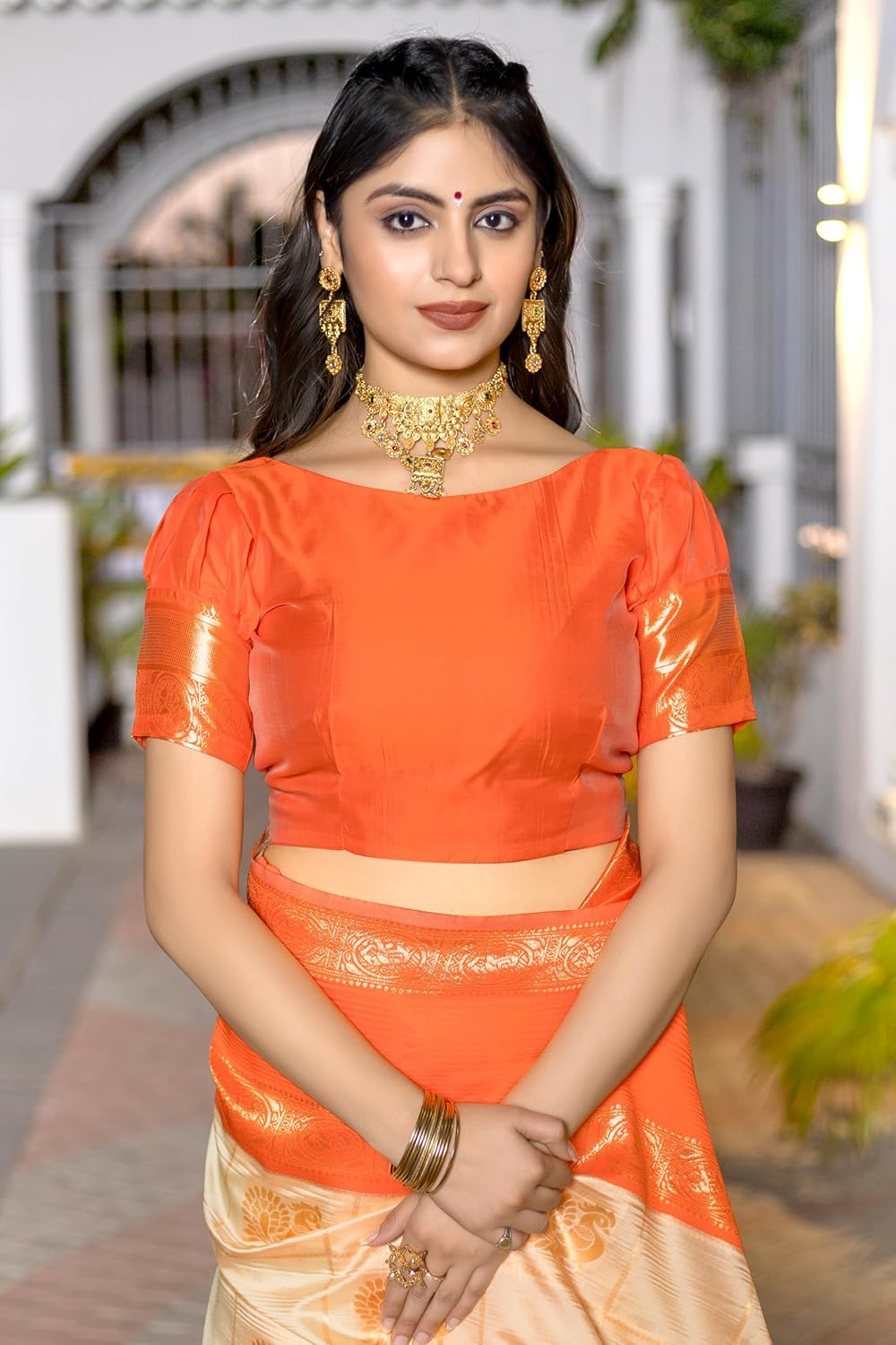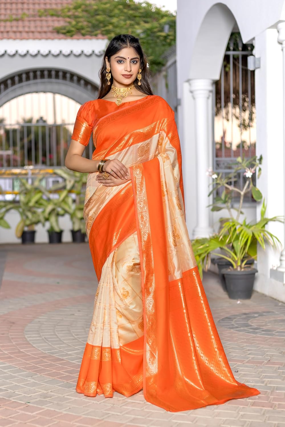 This Kanjeevaram silk saree is very beautiful. The work done on the saree makes it attractive. Kanchipuram silk saree is made from the finest fabric. Silk blouse enhances the look of saree. This Kanjeevaram silk saree will look great with earrings or even kundan jewellery. Shine in this festive season with Banarasi silk sarees. This is a beautiful saree for women 2024 from Janvi Fashion on Amazon.