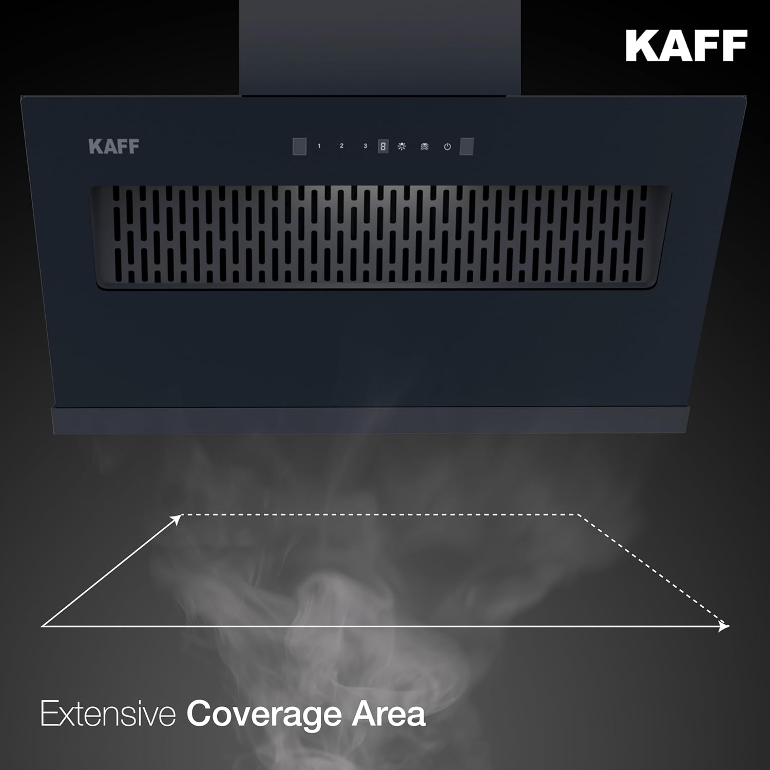 KAFF K-Series KES 90A Slant Filterless Auto Clean Kike Chimney introduction, 90 cm, 1450 m3/hr suction capacity touch and motion sensor with kitchen chimney-where the styles complete. Created with accurate engineering and innovative features, this chimney is designed to increase your cooking experience. Trouble-free filter-cum + dry heat auto cleaning technology, Kes90A ensures easy maintenance by eliminating traditional filters and automating the cleaning process. Dry heat auto-clean feature efficiently dislikes Greece and debris, directing them to the matte black oil collector for easy disposal.