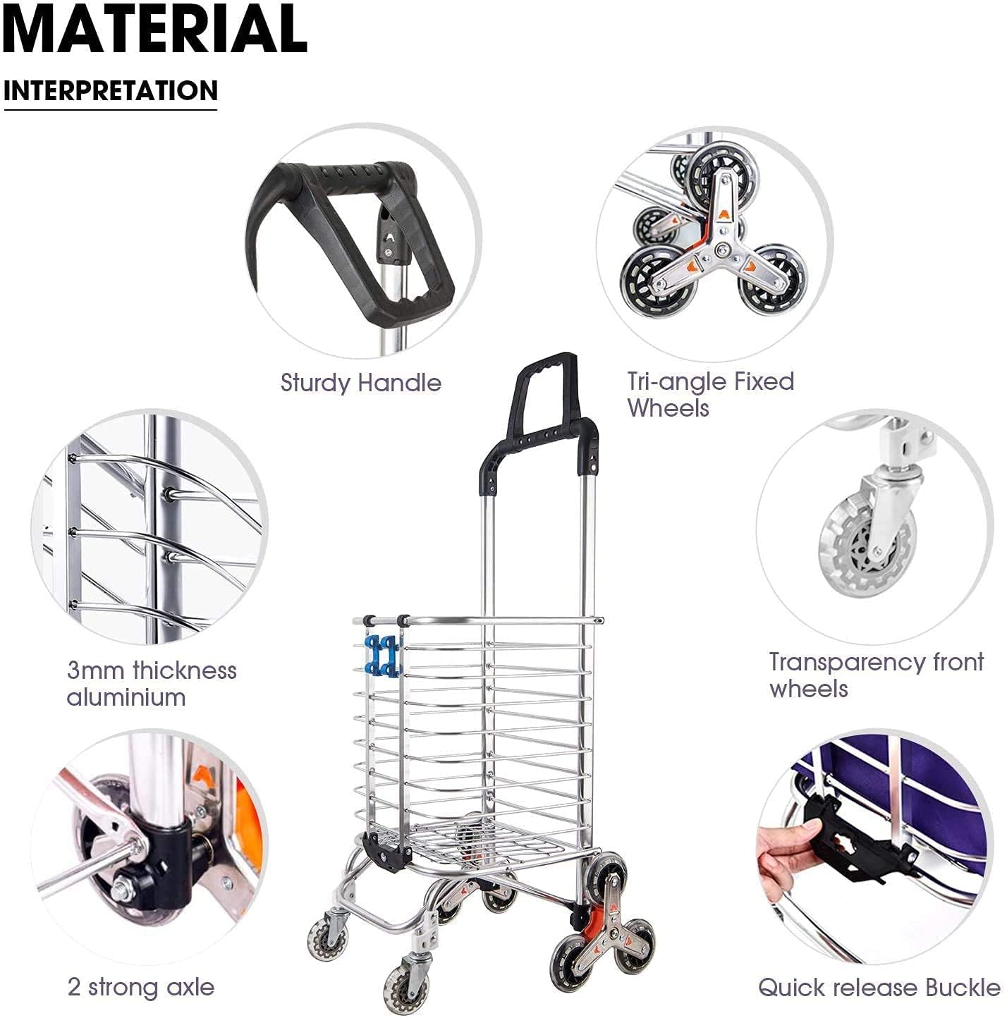 DURABLE ALUMINUM ALLOY FRAME FOR HEAVY LOADS Built to hold up to 177 pounds, the rustproof aluminum and stainless steel frame ensures long-term use without bending, making it perfect for easily transporting groceries, tools, laundry or office supplies.