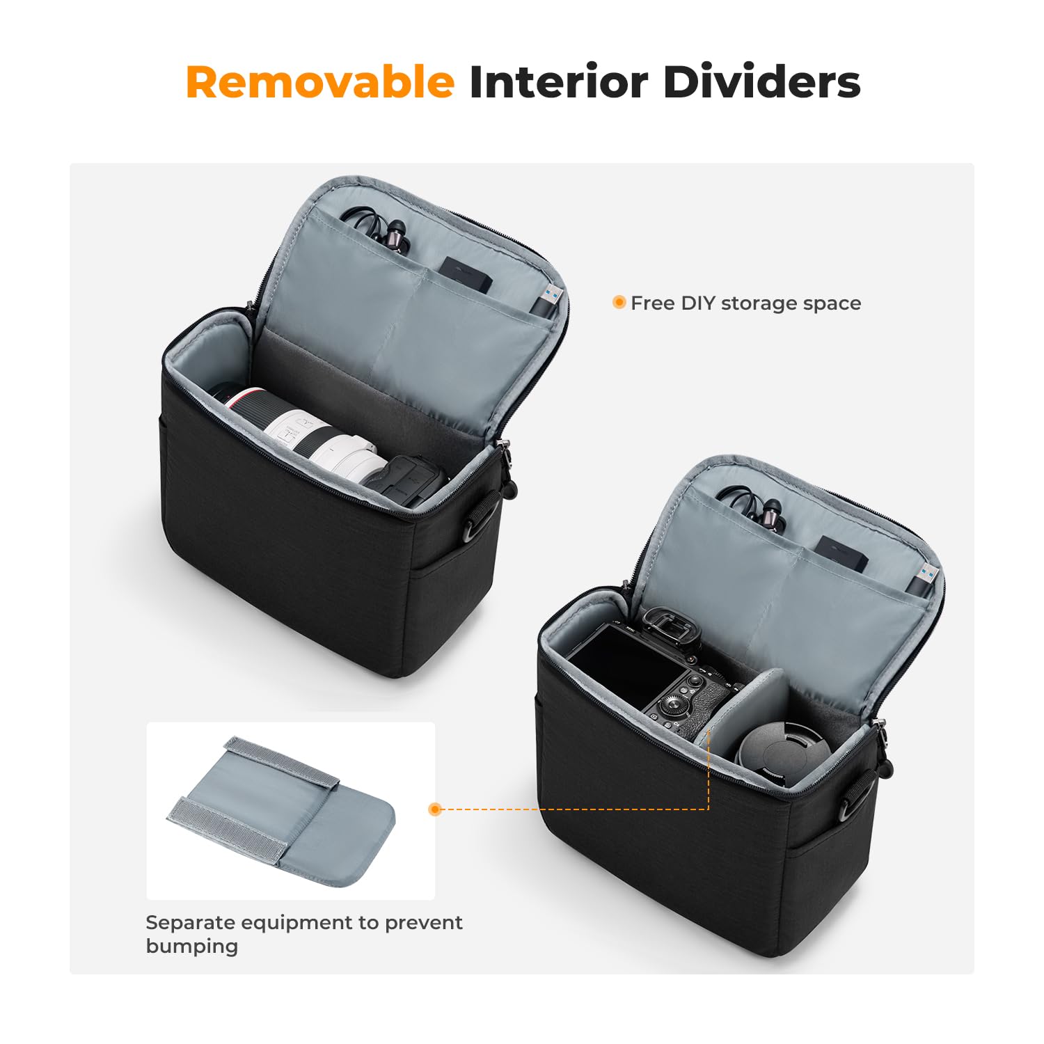✔Multi-Purpose: This crossbody camera bag comes with 1 removable padded divider for personal storage. Keep cameras and others separated and protected, while also enabling you to customize the main compartment for different sized camera devices. After removing the internal divider, it can be easily converted from a DSLR camera bag to a stylish everyday shoulder bag.