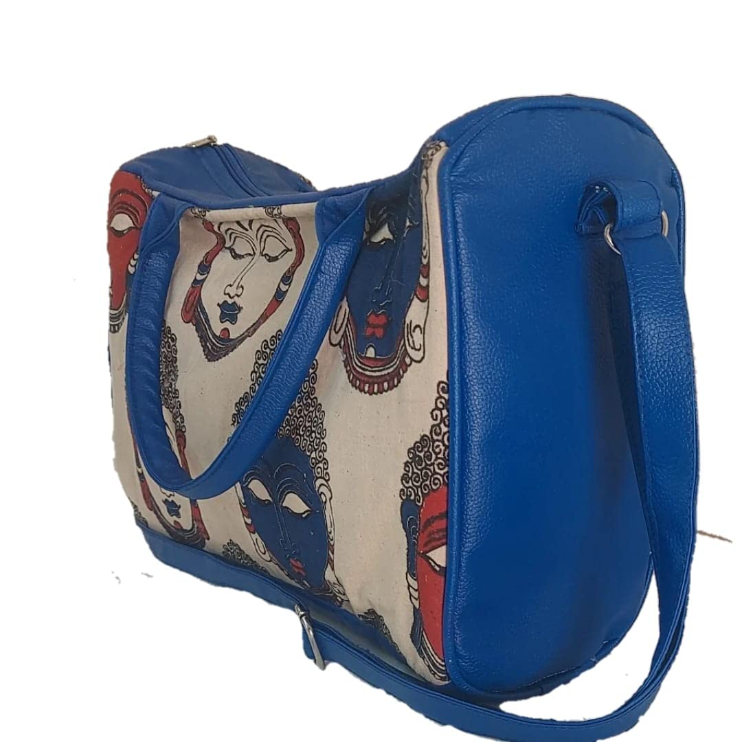 The stylish premium quality Kalamkari duffle bag is made from a combination of premium cotton fabric and vegan leather. The Buddha face of this bag makes it very trendy and stylish. The lining is made of premium quality polyester fabric. It has two zip pockets and one unzipped. In the internal zip pocket, you can keep your essentials safely. This duffel bag is specially designed with an adjustable shoulder strap for your comfort. Our commitment is to provide the best products to our customers.