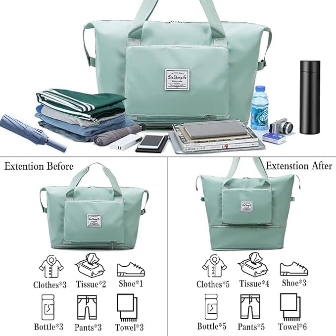 Discover ultimate versatility with this large capacity folding travel tote bag. Crafted from durable Oxford fabric, this waterproof duffel bag converts from a compact, easy-to-carry pouch to a spacious carry-on bag, perfect for a variety of occasions. Whether you’re hitting the gym, going on a business trip, going camping, or exploring new destinations, this bag suits your needs. The expandable design allows you to increase the capacity to store 3 items of clothing to 5, with dedicated space for shoes, cosmetics and accessories. Its lightweight construction makes it ideal for travel, while the waterproof material keeps your belongings safe. Features include sturdy handles, a shoulder strap for comfortable carrying, and a practical folding system that lets you compress the bag to a compact size when not in use. The thoughtful organization system helps separate wet and dry items, making it perfect for a gym session or a trip to the beach. Available in multiple colors, this versatile bag seamlessly combines functionality with practical design for all your carrying needs.