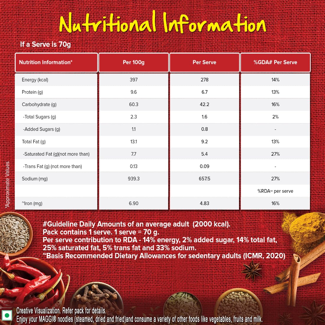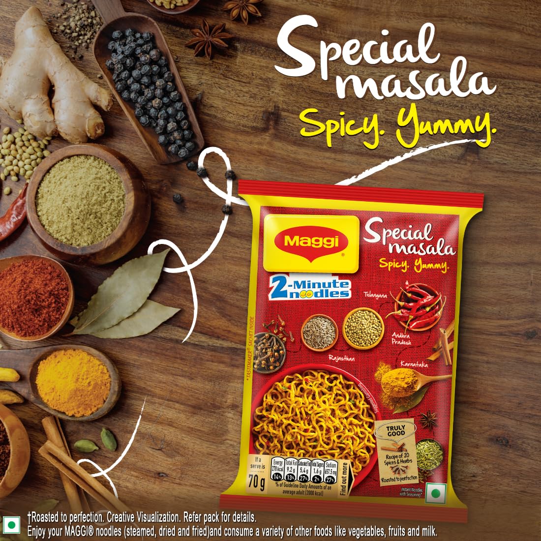 Nestle Maggi 2-minute Masala Noodles has been a classic Indian snack for over a decade. To move her favorite masala taste experience to the next level, Maggi introduced a recipe of new Maggi Special Masala Noodles, 20 Spices and Herbs, which provides more again defined Maggi Masala experience. Made with a mixture of fine ground and whole spices, and herbs, all new Maggie instant noodles have an additional special and flavored flavoring pouch. These spices are redeemed to perfection, which gives your Maggi noodles a different aroma and color. Uses: 1. Break the noodle cake into four parts. 2. Add noodles and testmakers to 210 ml (about 1 cup) of boiling water. 3. Cook in an open pan for 2 minutes. Sometimes shake. Do not drain the remaining water. Hold for 1 minute after cooking. serve hot. Storage instructions: Store in cool, dry and hygiene.