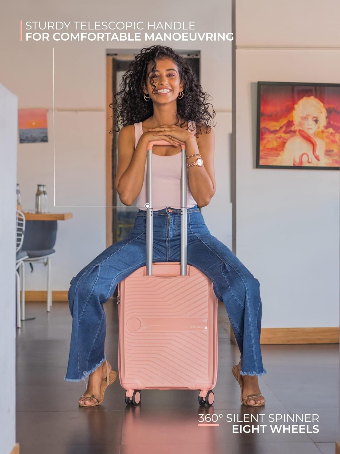 Medium (M) – 24-inch hard-sided spinner check-in luggage for 3 to 5 day trips. This bag can carry weight up to 15-20 kg.
