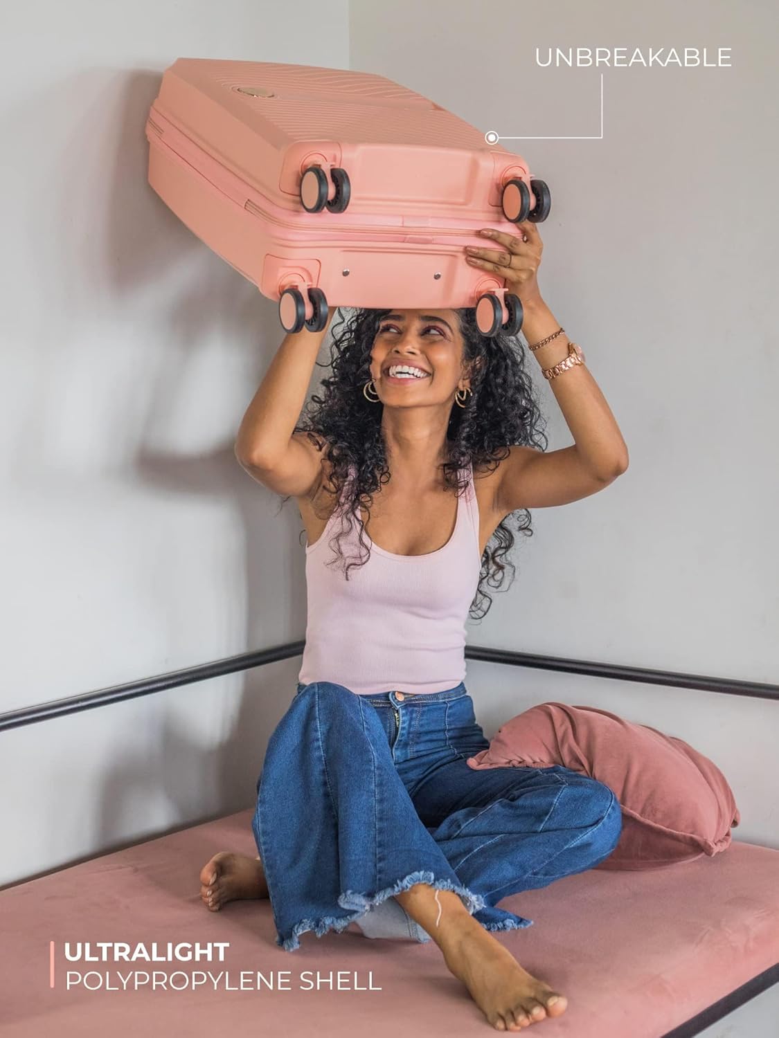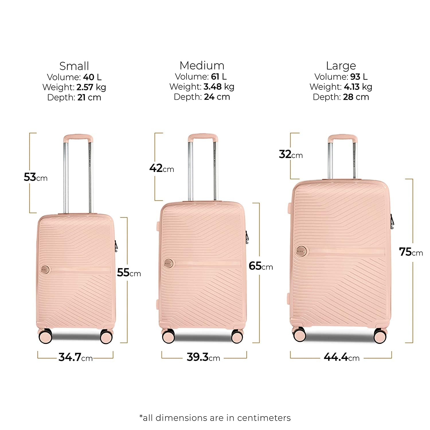 Medium (M) – 24-inch hard-sided spinner check-in luggage for 3 to 5 day trips. This bag can carry weight up to 15-20 kg.