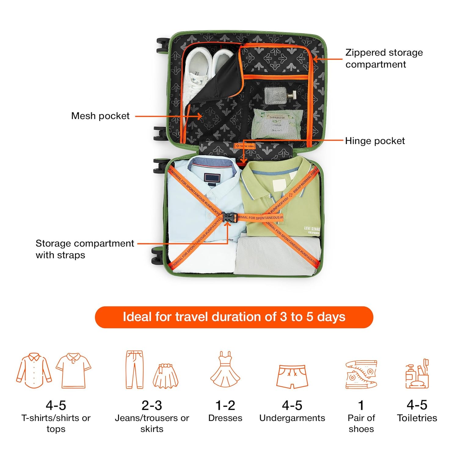 Spacious & Organized Interior: The interior is designed for maximum packing efficiency, featuring multiple compartments and adjustable straps to keep your clothes, accessories, and electronics neatly organized. The mesh pockets provide easy access to small items like toiletries or chargers.