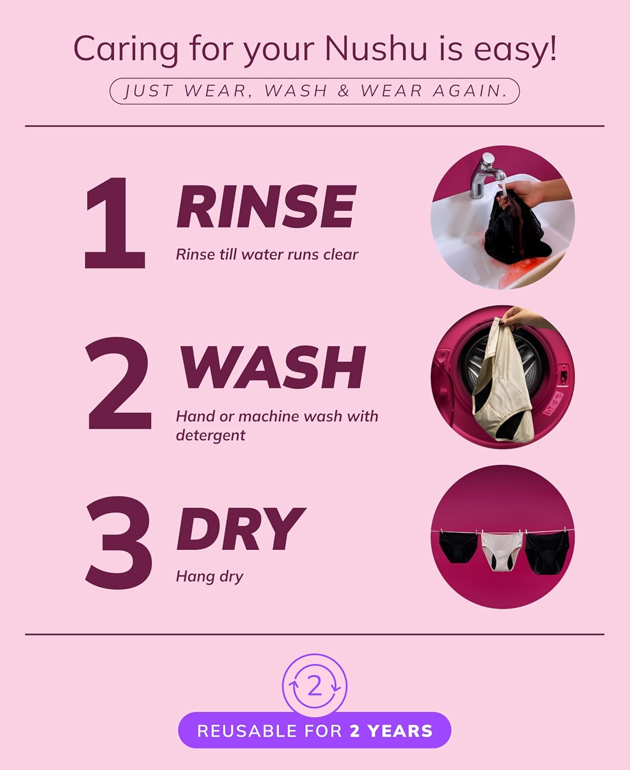 Unlike regular pads and tampons, you can use your Nushu panties for at least 2 years.