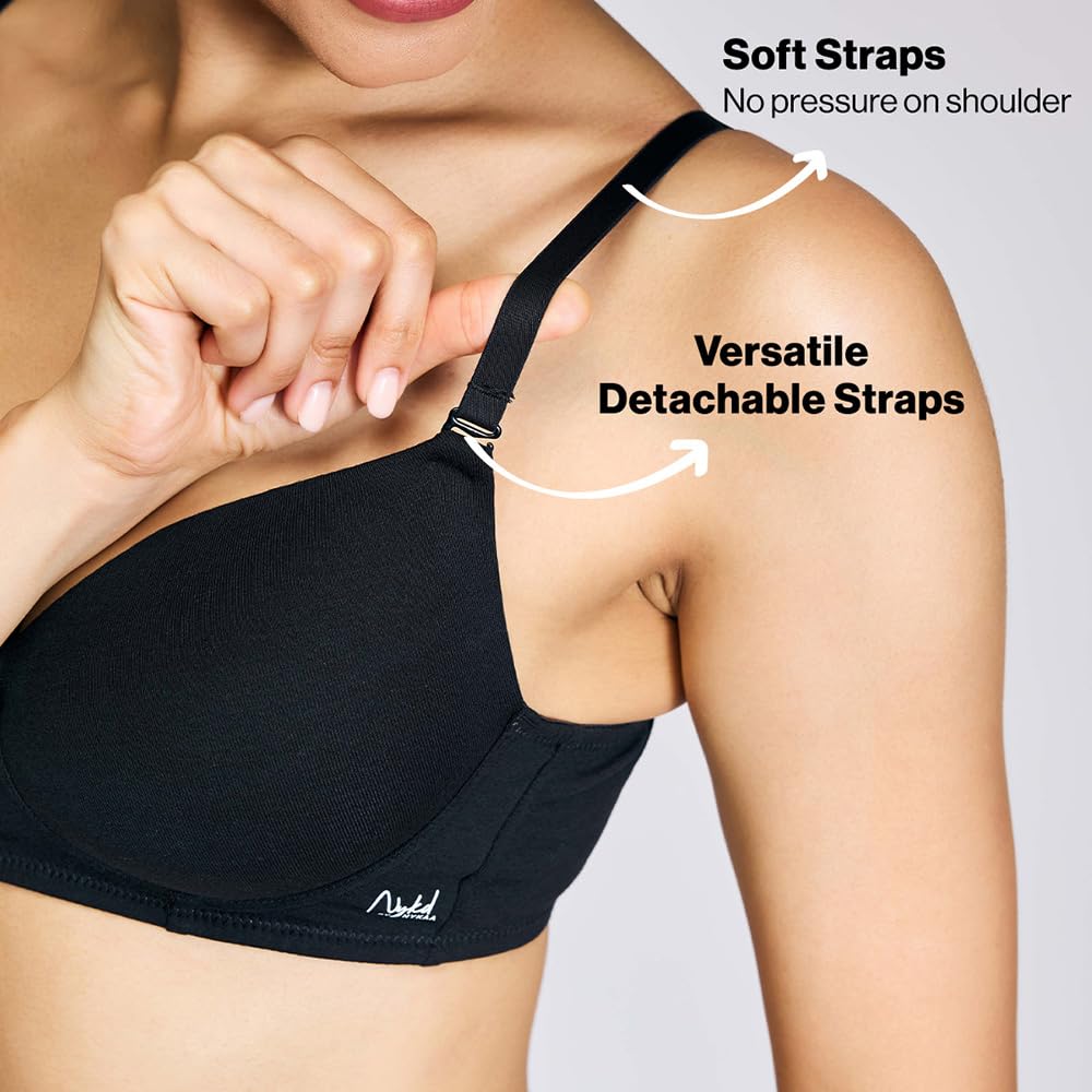Experience comfort all day long with this cotton padded wireless t-shirt bra designed for superior softness and seamless fit. Its ultra-soft bottom band gently grips your skin, prevents irritation and provides ample 3/4 coverage for natural support and shaping. Perfect for everyday wear, this bra matches with any outfit and ensures that you stay comfortable and confident all day long. Breathable perforated cups keep you cool, while the versatile design features super-soft, detachable straps that can be styled as a sleek cross-back for added flair. The wide wings and full rear frame provide additional support, smooth out bulges, and create a secure, flattering silhouette. Easy to care for, this bra requires gentle hand wash with mild detergent to maintain its shape and softness for long term wear.