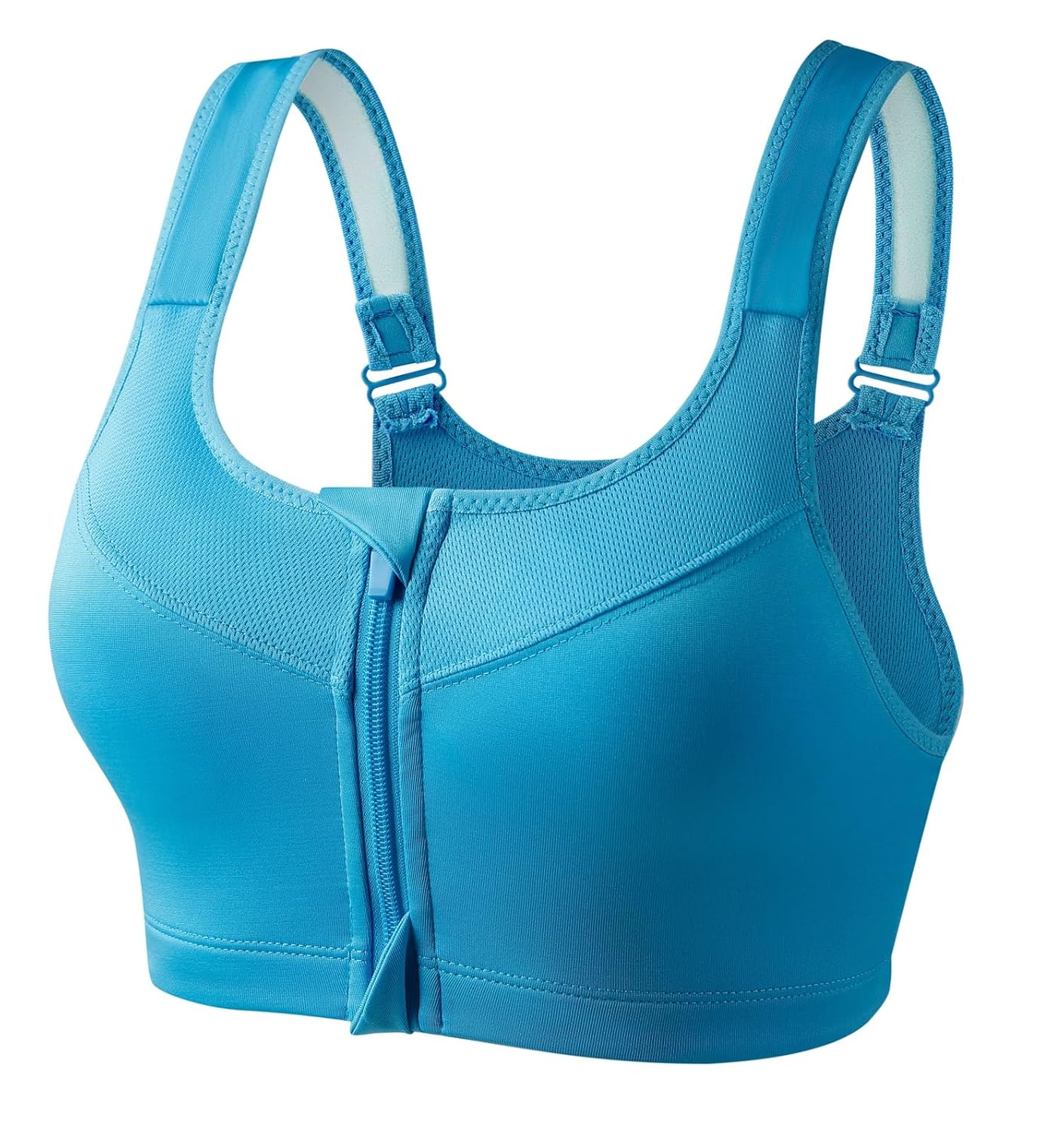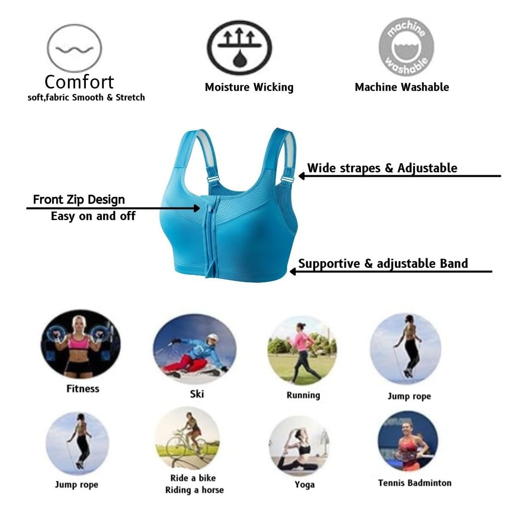 Step up your workout game with our medium support sports bra, specifically designed to provide unparalleled comfort and support during medium-impact activities like running, jogging, yoga and indoor or outdoor fitness training. Featuring an easy on/off self-locking front zipper with skin-friendly zipper cap, this sports bra ensures a hassle-free experience. Its 4-way stretch fabric adapts to your movements while its moisture-wicking properties keep you dry during intense workouts. Soft removable cups provide full coverage and extra support while maintaining your shape. With adjustable shoulder straps and enhanced side coverage under the arms, this sports bra not only ensures comfort and support but also enhances your natural curves. Say goodbye to traditional sports bras and embrace the perfect blend of style, comfort and performance for your fitness journey.