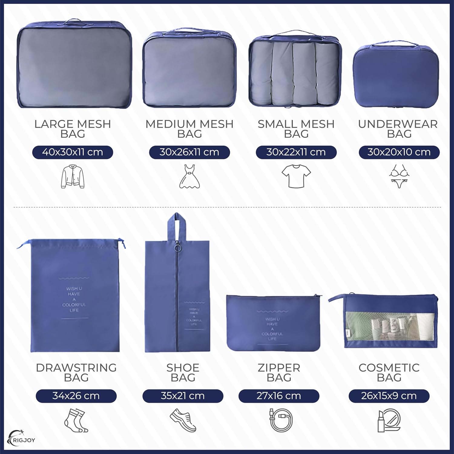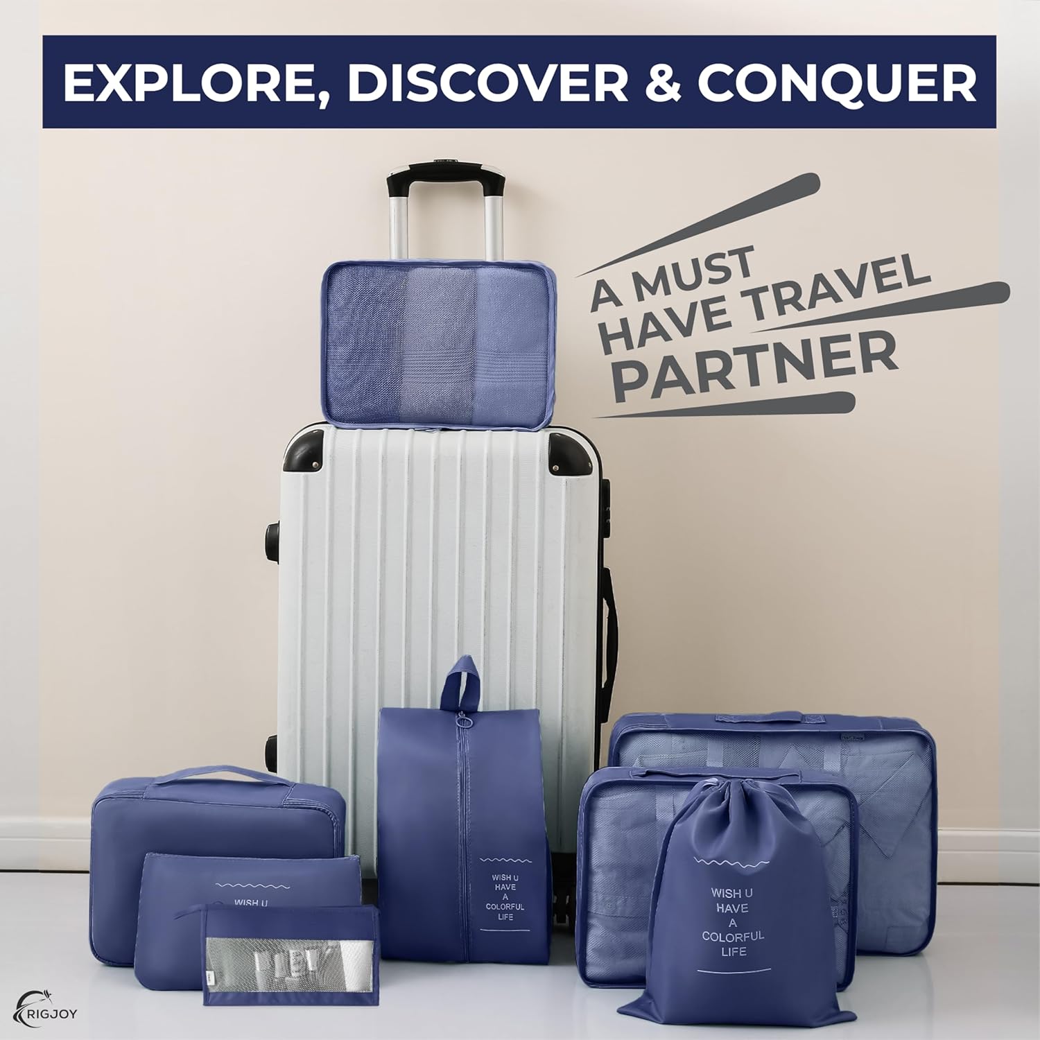 RIGJOY’s 8-piece packing cubes set is designed to streamline and organize your packing process, making traveling more convenient and efficient. The set includes a variety of sizes and specialty bags to meet various packing needs, all in a smooth grey. Set of 8: Includes multiple sizes of packing cubes, a toiletry/cosmetics pouch and a shoe bag. Material: Made of high-quality, durable and lightweight fabric, designed to withstand the rigors of travel. Large Packing Cube: Ideal for bulky items like jackets, pants and sweaters. Medium Packing Cubes (2): Perfect for shirts, blouses and shorts. Small Packing Cubes (2): Perfect for underwear, socks and accessories. Toiletry/Toiletry pouch: Keeps toiletries and cosmetics organized and easily accessible. Protects shoes from dirt and keeps them separate from clothes. Laundry bag: To separate dirty clothes from clean clothes. Benefits: Organization: Keeps clothes and accessories neatly organized and easy to find. Space Saving: Maximizes luggage space by compressing clothes and minimizing clutter. Easy Access: Mesh panels allow easy identification of contents without unpacking. Versatility: It can be used for a variety of purposes, such as storing electronics, gym clothes, or baby items. High-quality zippers and reinforced stitching ensure long-lasting use. Portability: Lightweight design adds minimal weight to the luggage. Usage Tips: Roll clothes into cubes before storing to save space and reduce wrinkles. Use different cubes for different categories of objects (for example, one cube for the top, another for the bottom). Place heavier items at the bottom of the suitcase and lighter items at the top for balanced weight distribution. ACCESSIBILITY: Keep frequently needed items in top cubes or toiletry pouches for frequent travelers: helps maintain organization and efficiency during trips. Family: Simplifies packing for multiple family members by keeping items separate. Business Traveller: Ensures professional attire is neat and ready for meetings. Vacationers: Streamline packing for long trips and multi-destination vacations. RIGJOY 8 Piece Packing Cubes Set offers a practical, stylish and efficient solution for organizing your stuff. The combination of durable materials, versatile size and thoughtful design features make it a must-have accessory for any traveler who wants to simplify their packing process and enhance their travel experience.