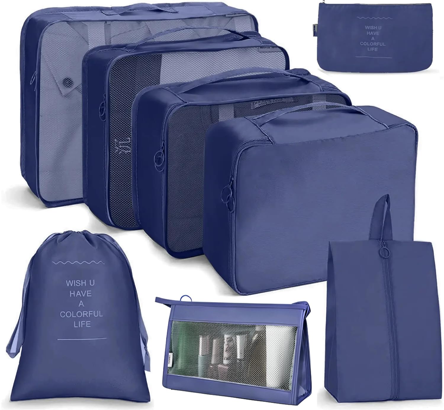 TRAVEL ORGANIZER MUST HAVE: Stay organized with the set of 8 packing cubes (3 mesh top bags, 1 innerwear bag, 1 cosmetic bag, 1 shoe bag, 1 zipper bag, 1 drawstring bag). Designed to optimize luggage space for stress-free travel.