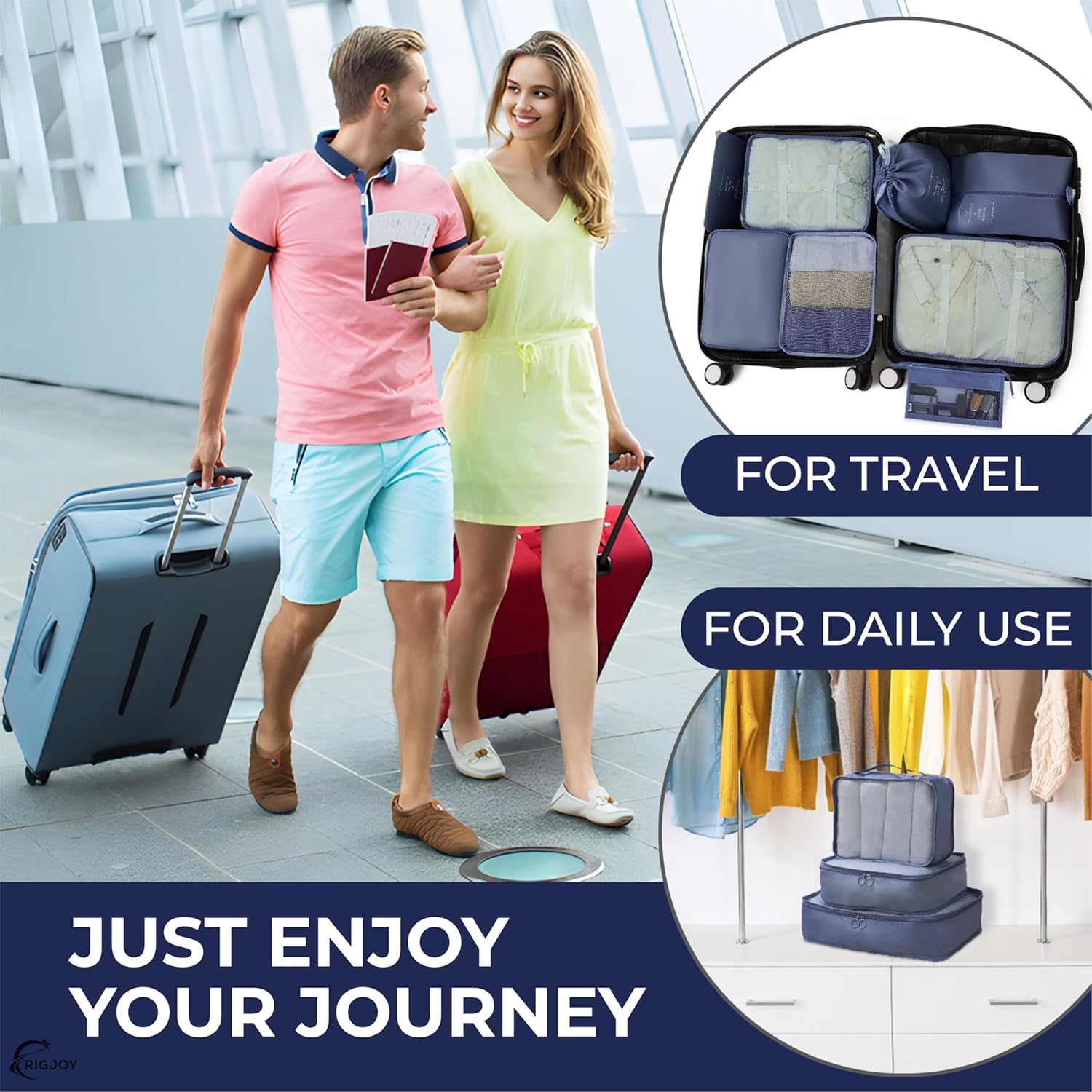 RIGJOY’s 8-piece packing cubes set is designed to streamline and organize your packing process, making traveling more convenient and efficient. The set includes a variety of sizes and specialty bags to meet various packing needs, all in a smooth grey. Set of 8: Includes multiple sizes of packing cubes, a toiletry/cosmetics pouch and a shoe bag. Material: Made of high-quality, durable and lightweight fabric, designed to withstand the rigors of travel. Large Packing Cube: Ideal for bulky items like jackets, pants and sweaters. Medium Packing Cubes (2): Perfect for shirts, blouses and shorts. Small Packing Cubes (2): Perfect for underwear, socks and accessories. Toiletry/Toiletry pouch: Keeps toiletries and cosmetics organized and easily accessible. Protects shoes from dirt and keeps them separate from clothes. Laundry bag: To separate dirty clothes from clean clothes. Benefits: Organization: Keeps clothes and accessories neatly organized and easy to find. Space Saving: Maximizes luggage space by compressing clothes and minimizing clutter. Easy Access: Mesh panels allow easy identification of contents without unpacking. Versatility: It can be used for a variety of purposes, such as storing electronics, gym clothes, or baby items. High-quality zippers and reinforced stitching ensure long-lasting use. Portability: Lightweight design adds minimal weight to the luggage. Usage Tips: Roll clothes into cubes before storing to save space and reduce wrinkles. Use different cubes for different categories of objects (for example, one cube for the top, another for the bottom). Place heavier items at the bottom of the suitcase and lighter items at the top for balanced weight distribution. ACCESSIBILITY: Keep frequently needed items in top cubes or toiletry pouches for frequent travelers: helps maintain organization and efficiency during trips. Family: Simplifies packing for multiple family members by keeping items separate. Business Traveller: Ensures professional attire is neat and ready for meetings. Vacationers: Streamline packing for long trips and multi-destination vacations. RIGJOY 8 Piece Packing Cubes Set offers a practical, stylish and efficient solution for organizing your stuff. The combination of durable materials, versatile size and thoughtful design features make it a must-have accessory for any traveler who wants to simplify their packing process and enhance their travel experience.