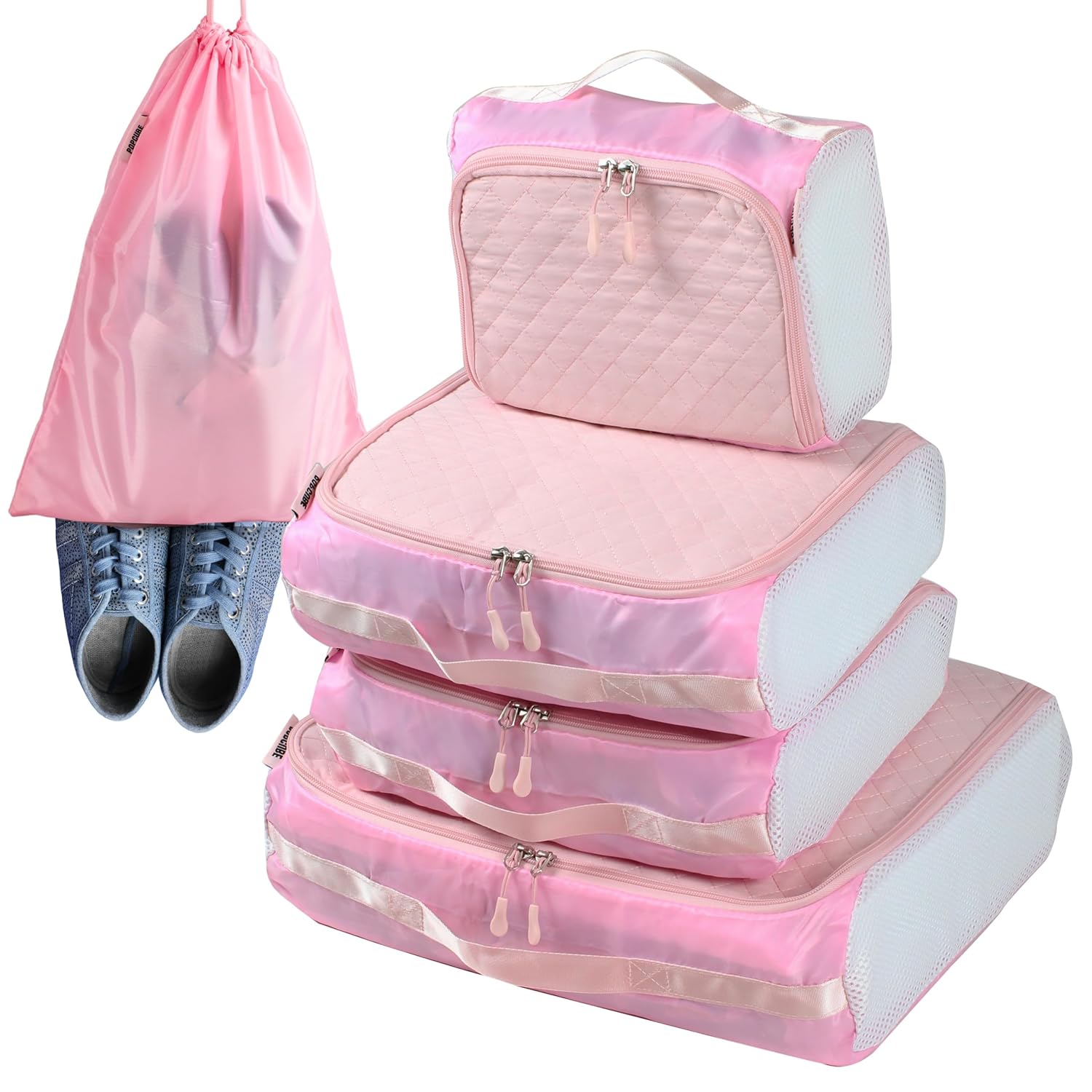 【5 PCS Packing Cubes】Travel cubes contain 5 bags: Large Bag*1, Medium Bag*2, Small Bag*1, Drawstring Shoe Bag*1. These luggage organizers for travel bags come in different sizes and can be used for different packing purposes and allow you to pack more clothes. The dedicated shoe bag fits 1-2 pairs of shoes or it can be a laundry bag to separate your dirty clothes. Keep your luggage neat and tidy with this travel organizer set for men and women.