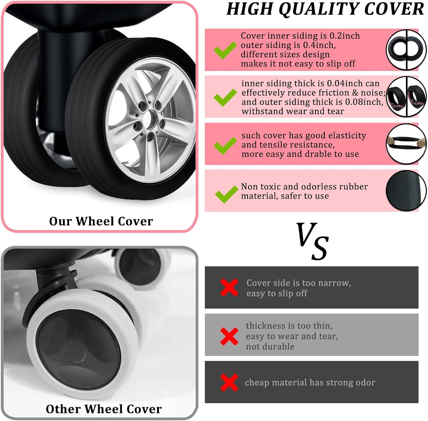 【YOU SHOULD KNOW】The luggage wheels cover is specially designed for 8-spinner wheels carried on suitcases. Before purchasing, please confirm that your suitcase is double-wheel, and the size of the wheels and the distance between the wheels and the axle and fenders meet the size requirements described above in our main picture.