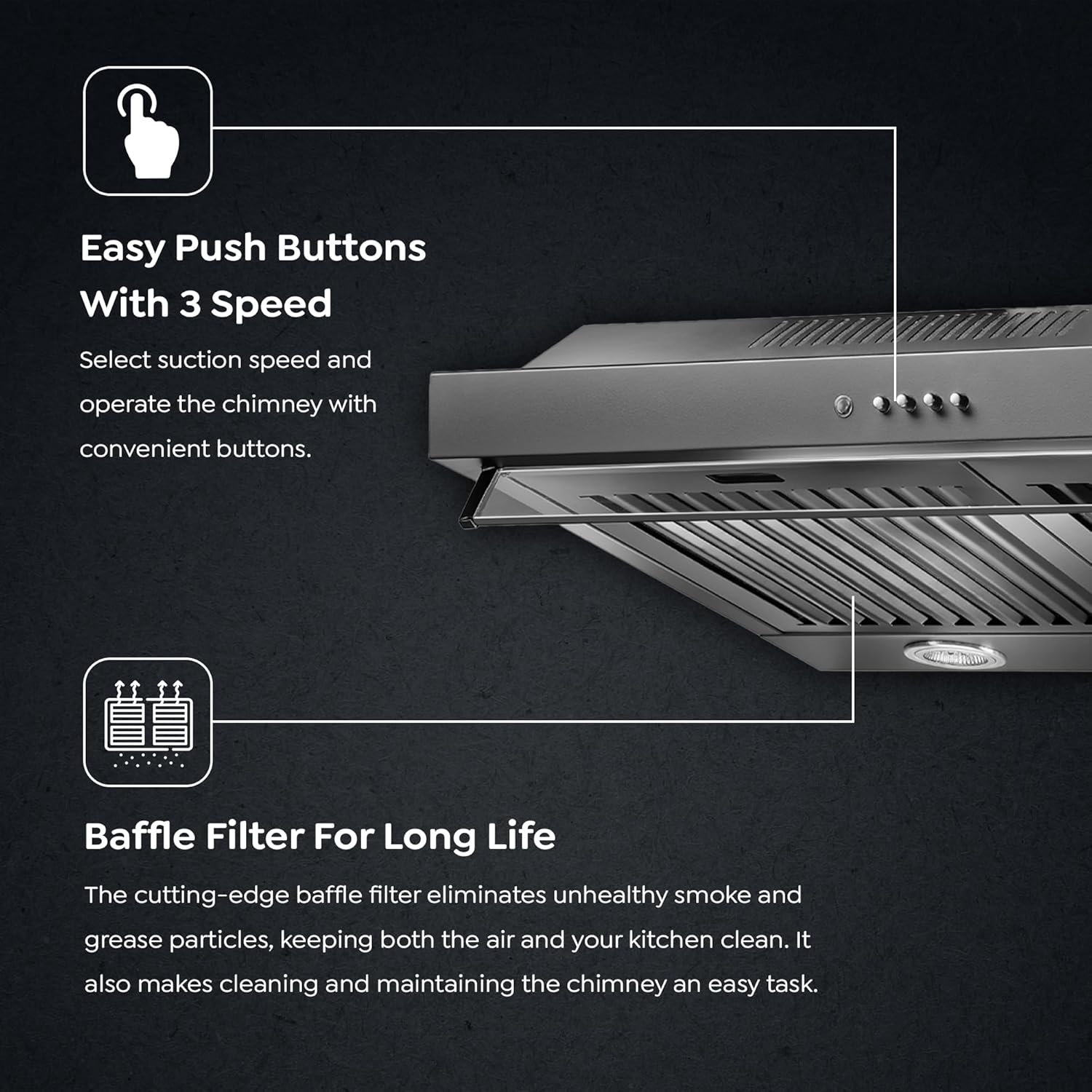 BAFFLE FILTER- The state-of-the-art buffal filter eliminates unhealthy smoke and grease particles, keeping both air and your kitchen clean. It also cleanses and maintains an easy task to the chimney.