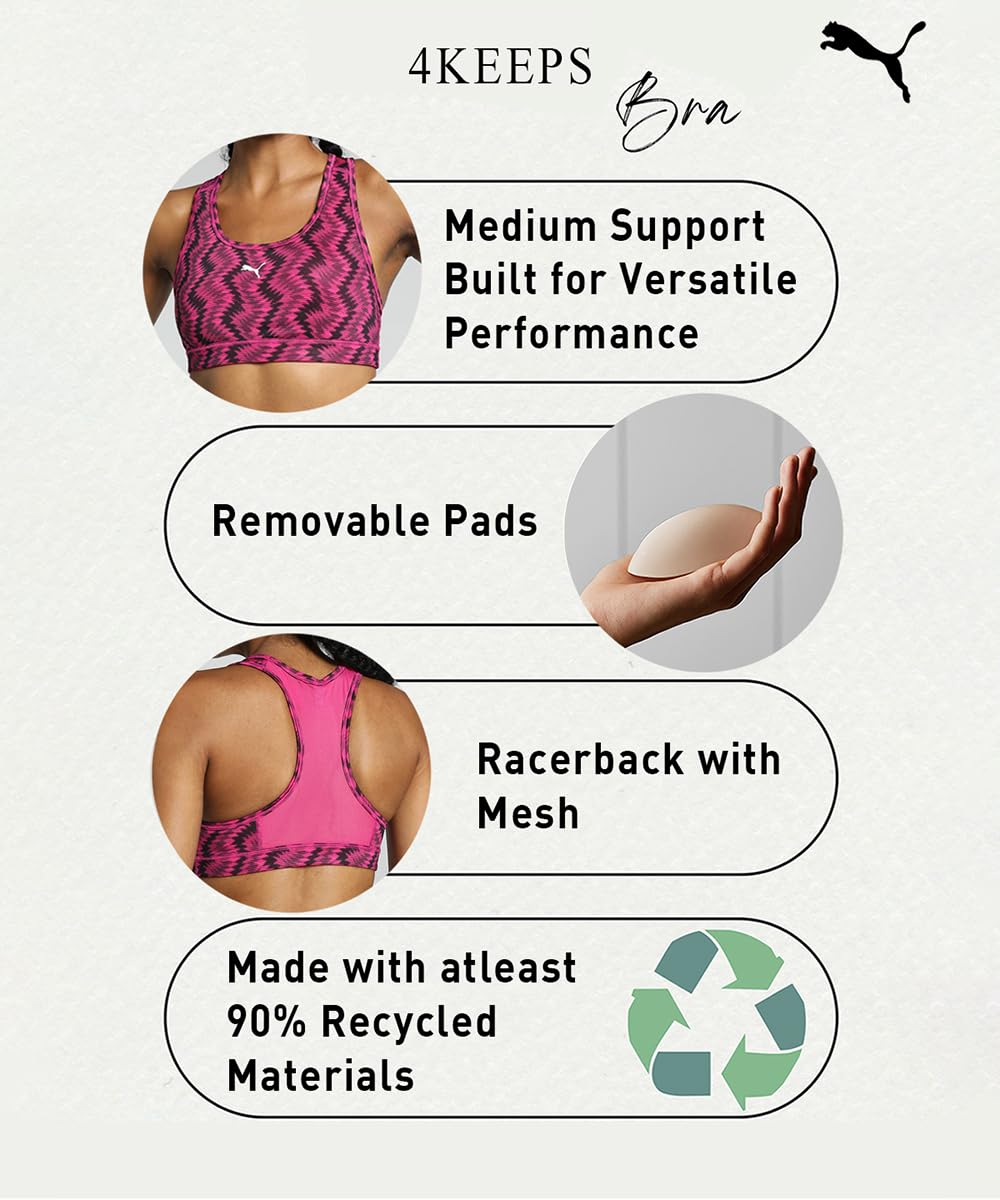 Product Story: 4Keeps Bra Puma’s signature medium-affected performance bra. It is designed to be your Go-Two, versatile bra. This bra has a halter neck with 3 cm straps for breathing ability, unrestricted movement and adjustable mesh for a dial-in fit. Features and Benefits Drycell: Performance technique is designed for moisture from the body and keeps you sweat free during exercise done with at least 70% recycled materials. Fit-shoulder straps with a raceback construction for the unrestricted range of motion. Comfort -3 cm soft brush underbands enclosed elastic breathing ability – Mesh back in incert for enhanced versatile sleeveless regular length halter noble