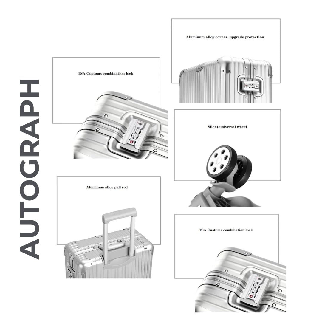 1 Full Aluminum Body 2 Aluminum Corner 3 TSA Lock Zipless 4 Silent 8 Wheels 5 Aluminum Handle