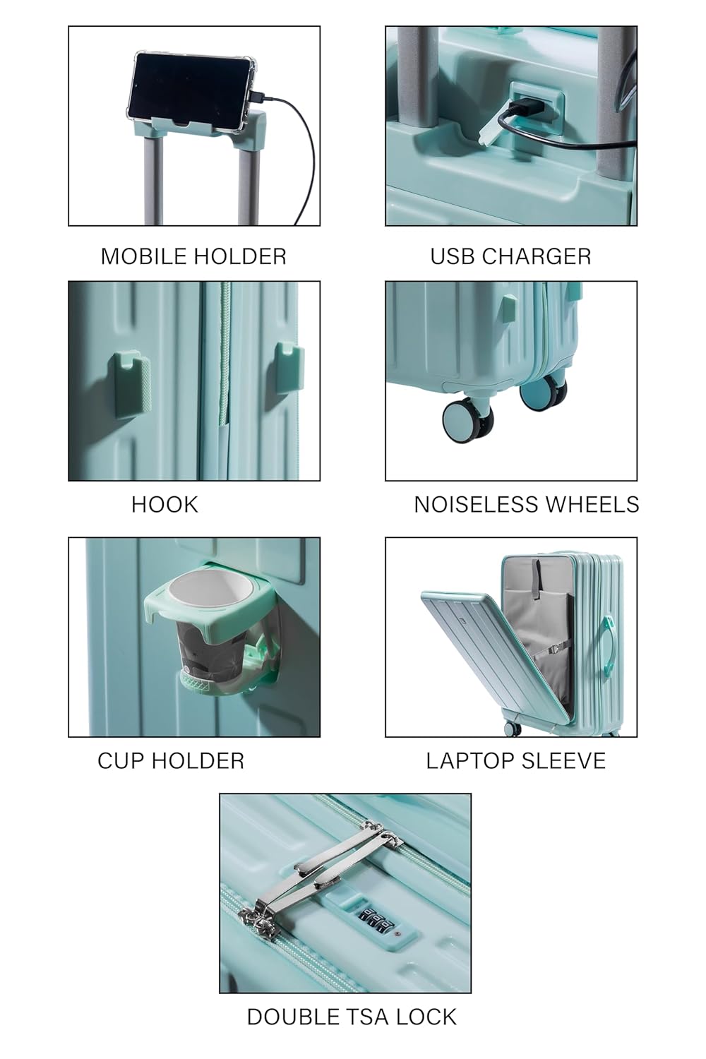 USB Charging Port: The convenient USB port allows you to charge devices on the go without opening your suitcase. How to Use: Connect your charged power bank with the USB cable provided inside the bag. When traveling, connect your phone cable to the USB slot on the outside of the bag to charge your phone.