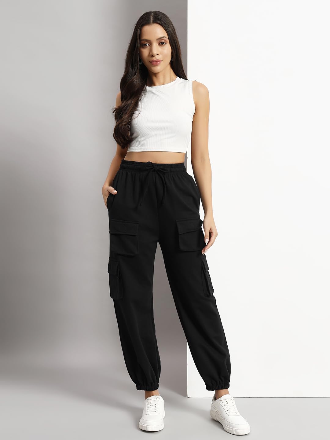 Relaxed fit women’s cargo pant with pockets made from enzyme biowash cotton blend fabric, designed with a comfortable fit for all-day wear.