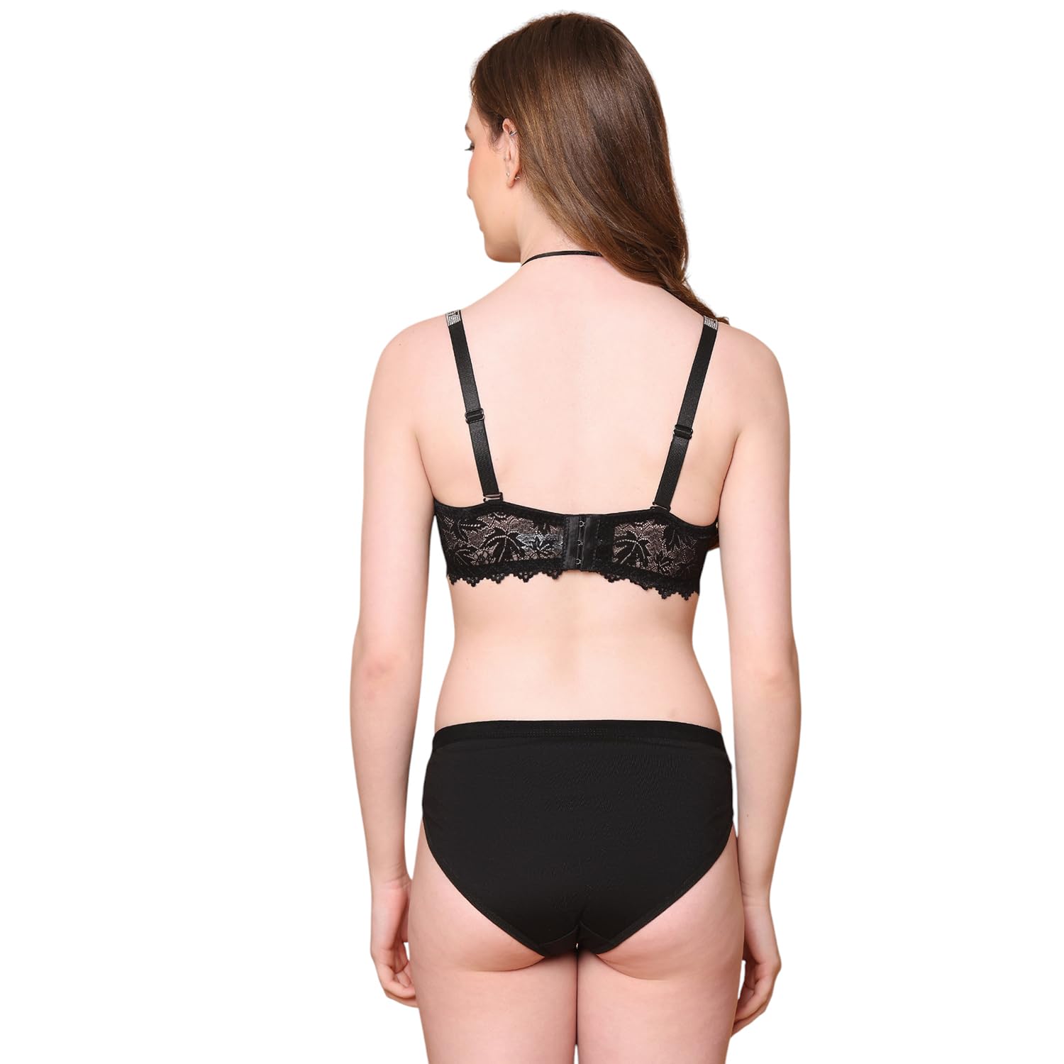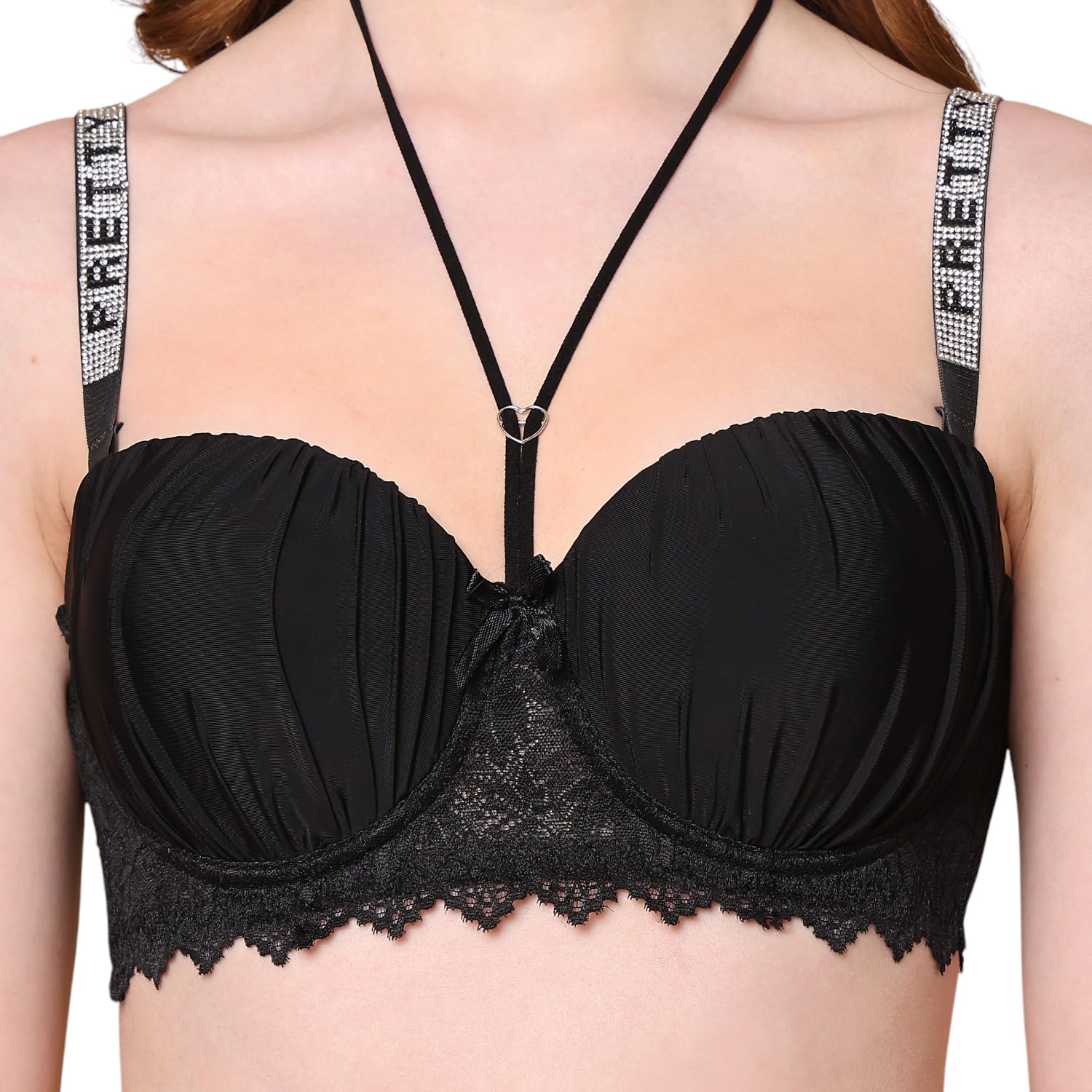 Kuttos Prettycat Balcony Bra with black panty for a stunning look. Padded cups to protect modesty. Crafted from exquisite self-patterned polyester and lace fabric. Underwired cups for light lift. Wide set straps for wide neck dresses. Comes with normal and rhinestone glitter straps. Detachable straps to wear as a strapless bra or style in multiple ways. Cute bow in the center for decoration. Triple hook and eye enclosure on large cups. Designed with cage-style on the front. Dual strap on back secured with hook and eye enclosures. Soft elastic at the waistband and leg opening for a comfortable fit. Double layer gusset for hygiene.