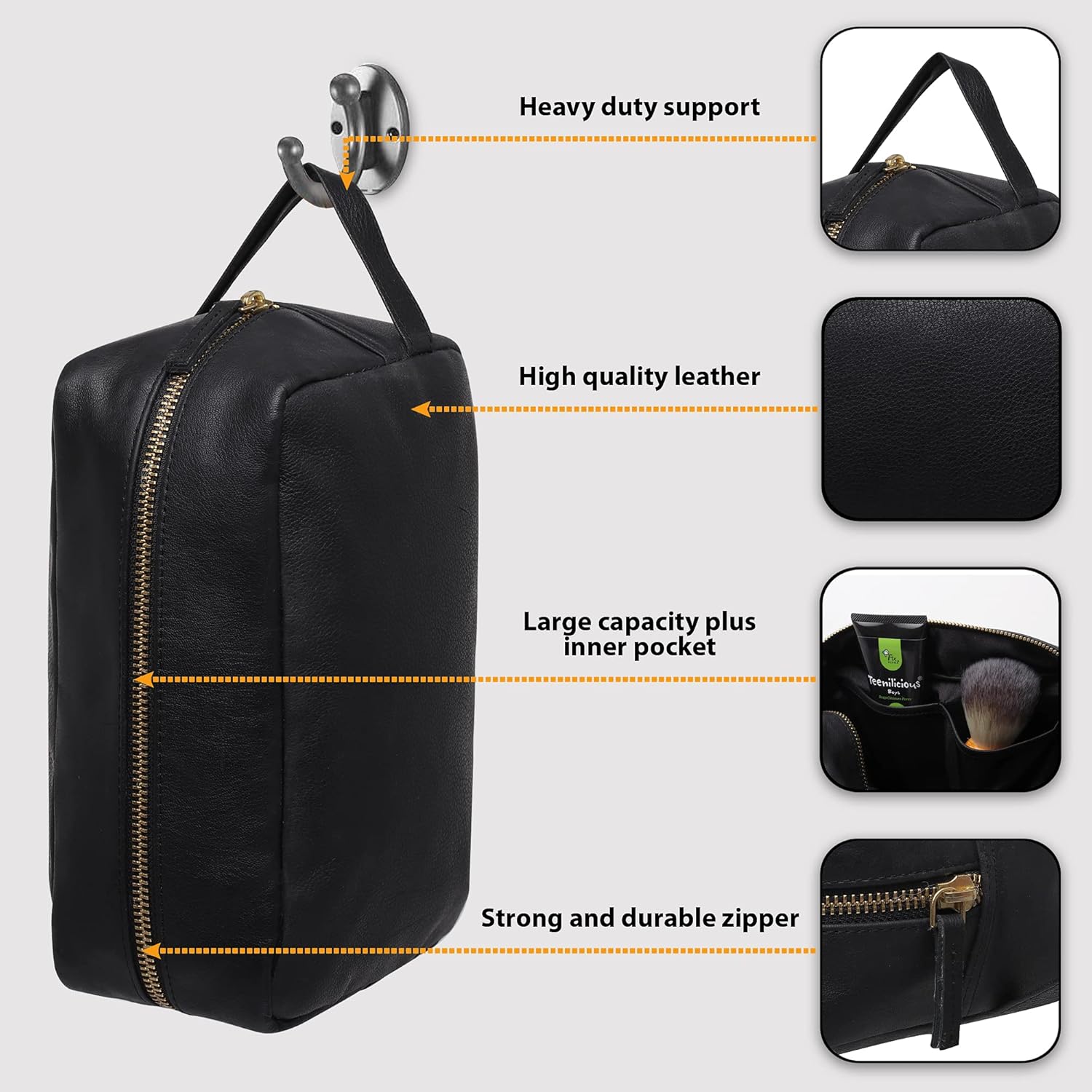 – The pinnacle of both luxury and practicality for your travel essentials. Carefully crafted from top-grade genuine leather this toiletry pouch boasts a sophisticated, enduring design that complements any journey. Its spacious interior, thoughtfully divided for effortless organization, ensures your toiletries are always at hand. Strong, high-grade metallic zippers ensure a secure seal, giving you peace of mind every step of your journey. Beyond travel, its timeless beauty makes it a versatile companion for your everyday needs!