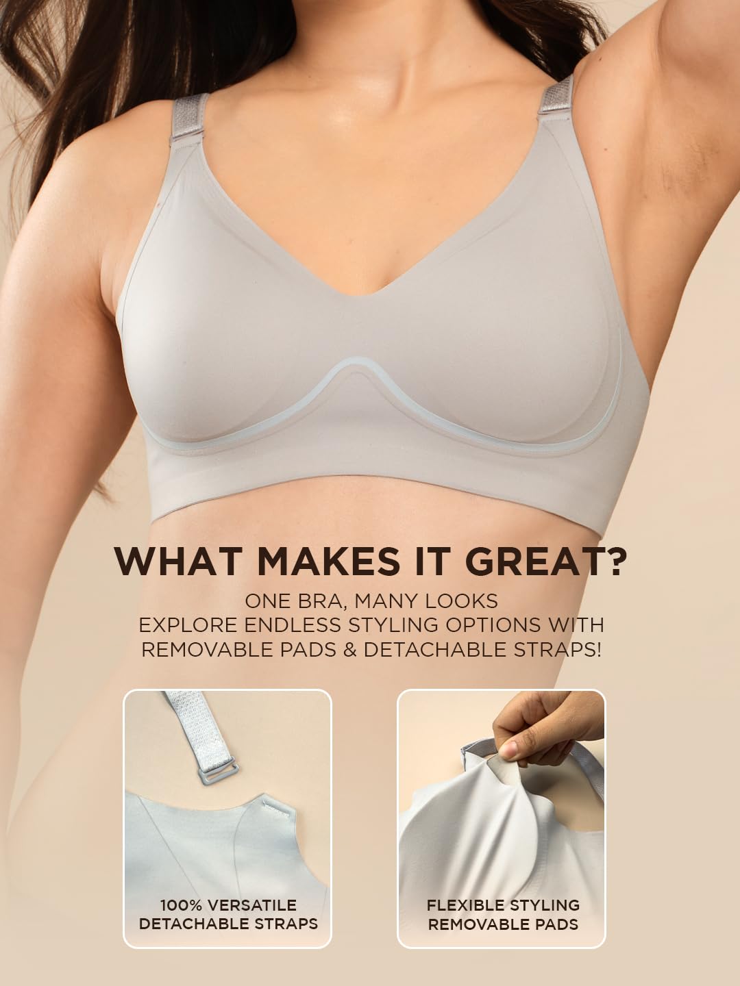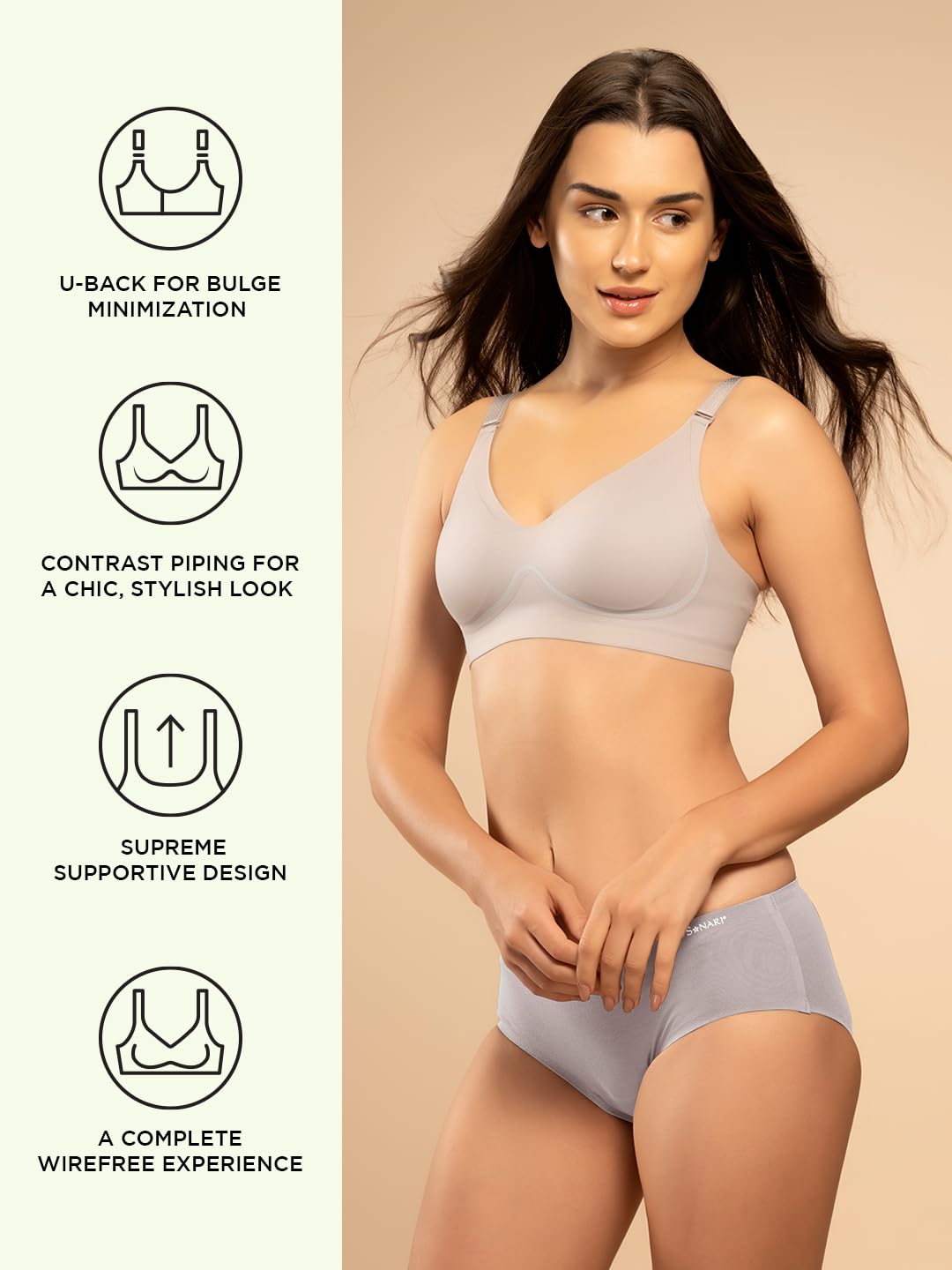 The Sonari SM 106 Medium Coverage Padded Seamless Bra is designed to provide comfort, support and versatility, making it an essential addition to your everyday wardrobe. Crafted from a premium nylon blend infused with elastane, this bra feels ultra-soft, breathable and irritation-free, ensuring comfort all day long. The smooth, seamless texture provides a second skin feel, perfect for daily wear, workouts or long-term use without any discomfort. The U back design is thoughtfully engineered to smooth out the curves of the back by distributing pressure evenly, helping to improve posture while providing superior comfort. It also reduces strap slippage, ensuring everything stays securely in place throughout the day. Contrast piping detail enhances the elasticity of the bra, providing superior stretch, flexibility and durability without compromising comfort. This wire-free, padded bra offers the ideal balance of support and softness. Lightly padded cups provide a natural shape, while the seamless design prevents irritation and avoids visible lines under clothing. Adjustable and removable straps allow for customized styling, making this bra perfect for casual tops, dresses, traditional apparel, and even loungewear. The seamless construction ensures a smooth, invisible finish under clothing, providing effortless elegance and confidence. Whether you’re looking for daily comfort, advanced posture support, or a bra that adapts to your sartorial needs, the Sonari SM 106 is your go-to choice. Experience comfort, support and seamless style all day long with this essential bra.