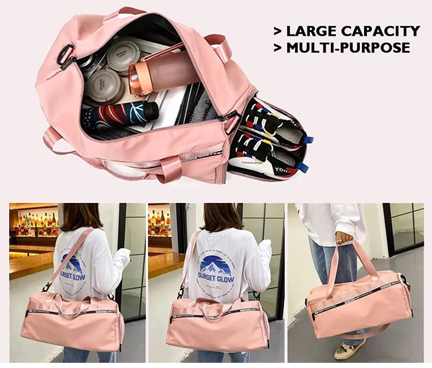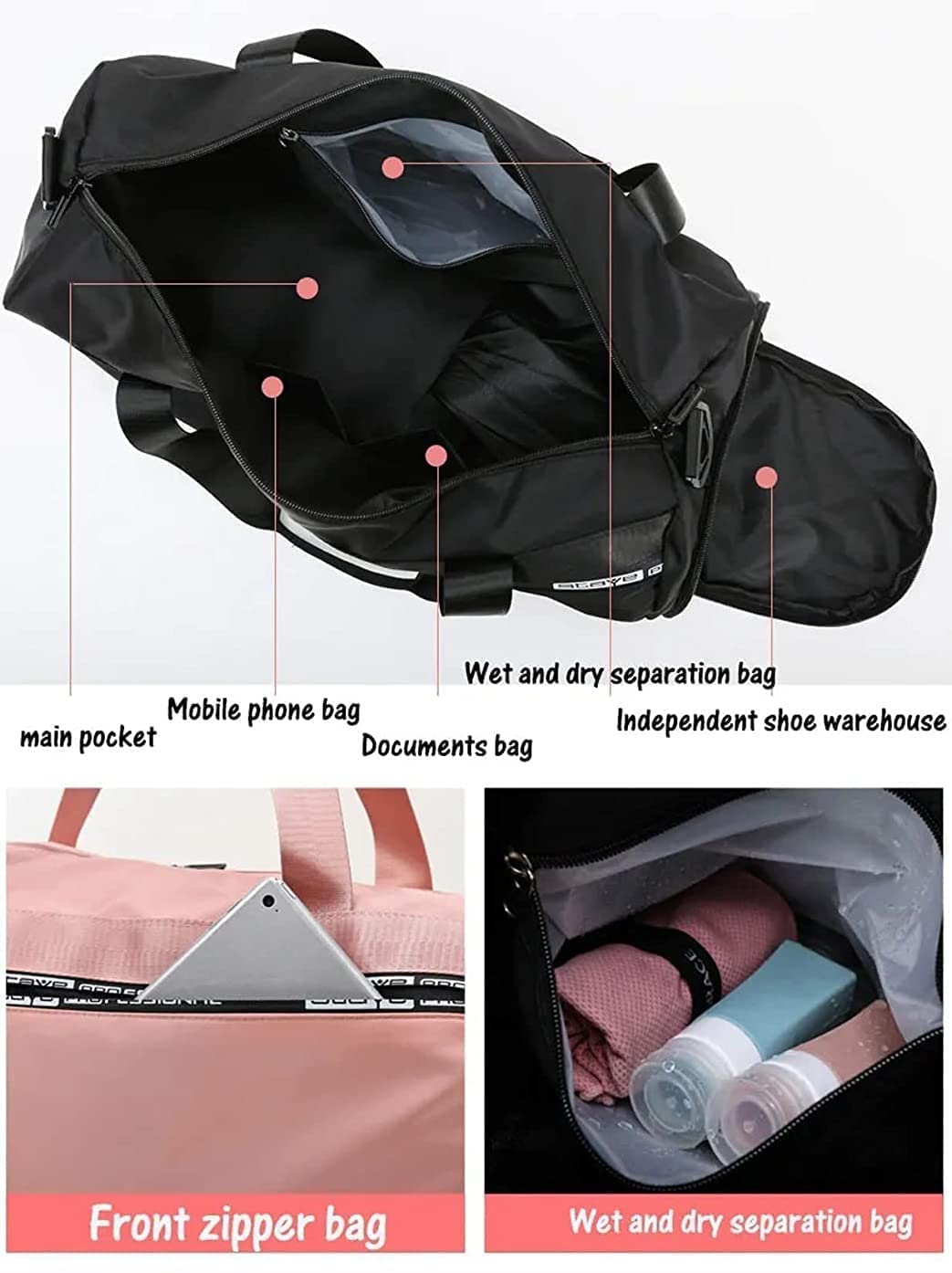 Functional Divisions: Our duffle bag includes 3 main functional divisions. 1 spacious main pouch, 1 fully waterproof wet pocket (for wet swimwear/gym sweats, socks and towel), 1 independent shoe compartment (fits 13′ sneakers).