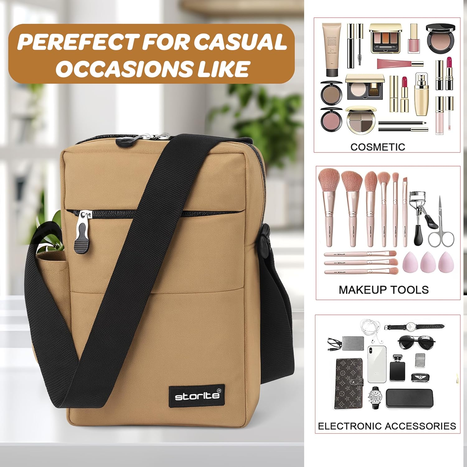 Storite 10 Inch Stylish Padded Mini Sling Bag for Men and Women, Small Passport Travel Bag and Small Sling Bag with Water Bottle Pocket (25 x 16 x 7.5 cm, Khakhi)