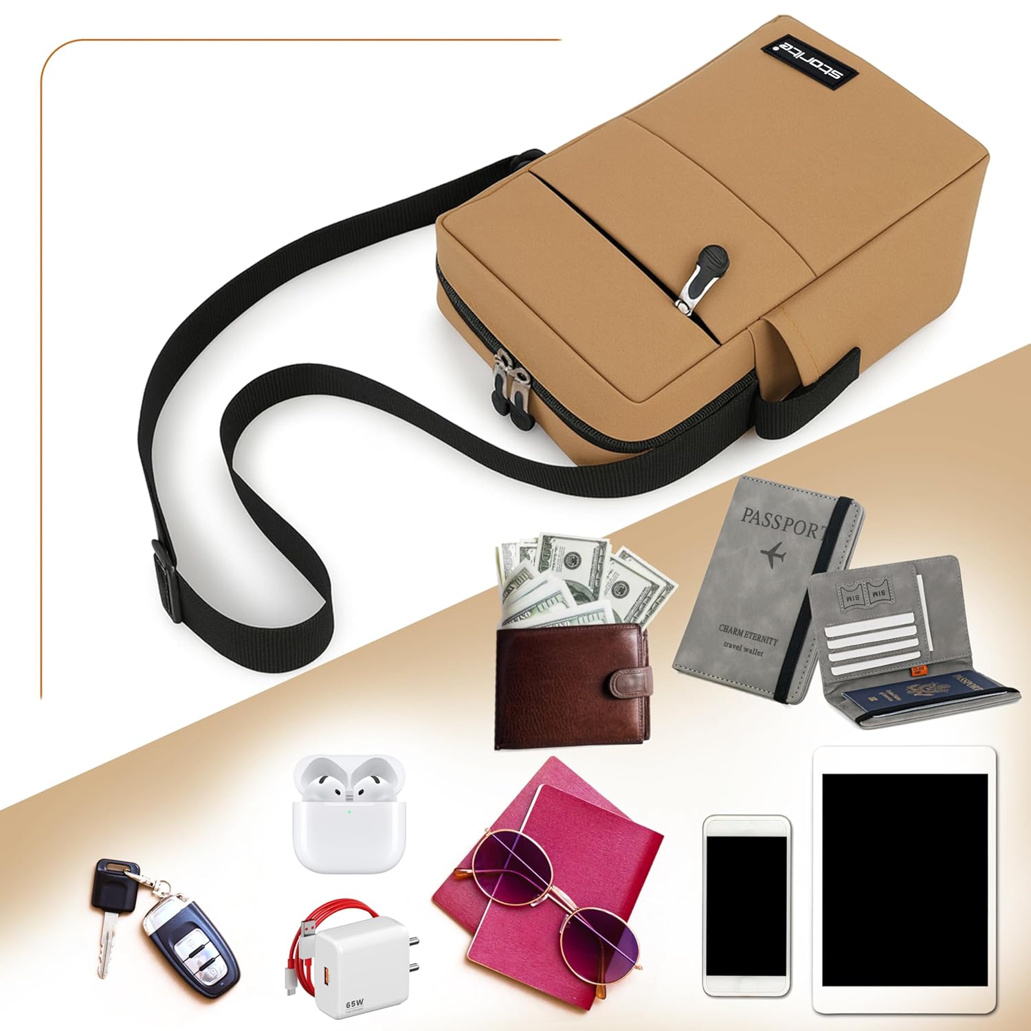 Storite 10 Inch Stylish Padded Mini Sling Bag for Men and Women, Small Passport Travel Bag and Small Sling Bag with Water Bottle Pocket (25 x 16 x 7.5 cm, Khakhi)